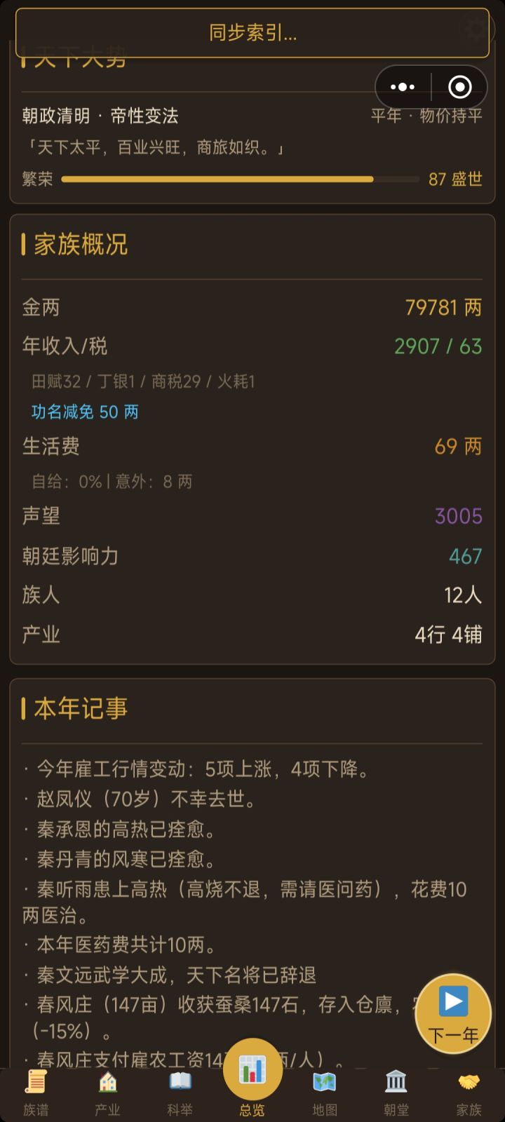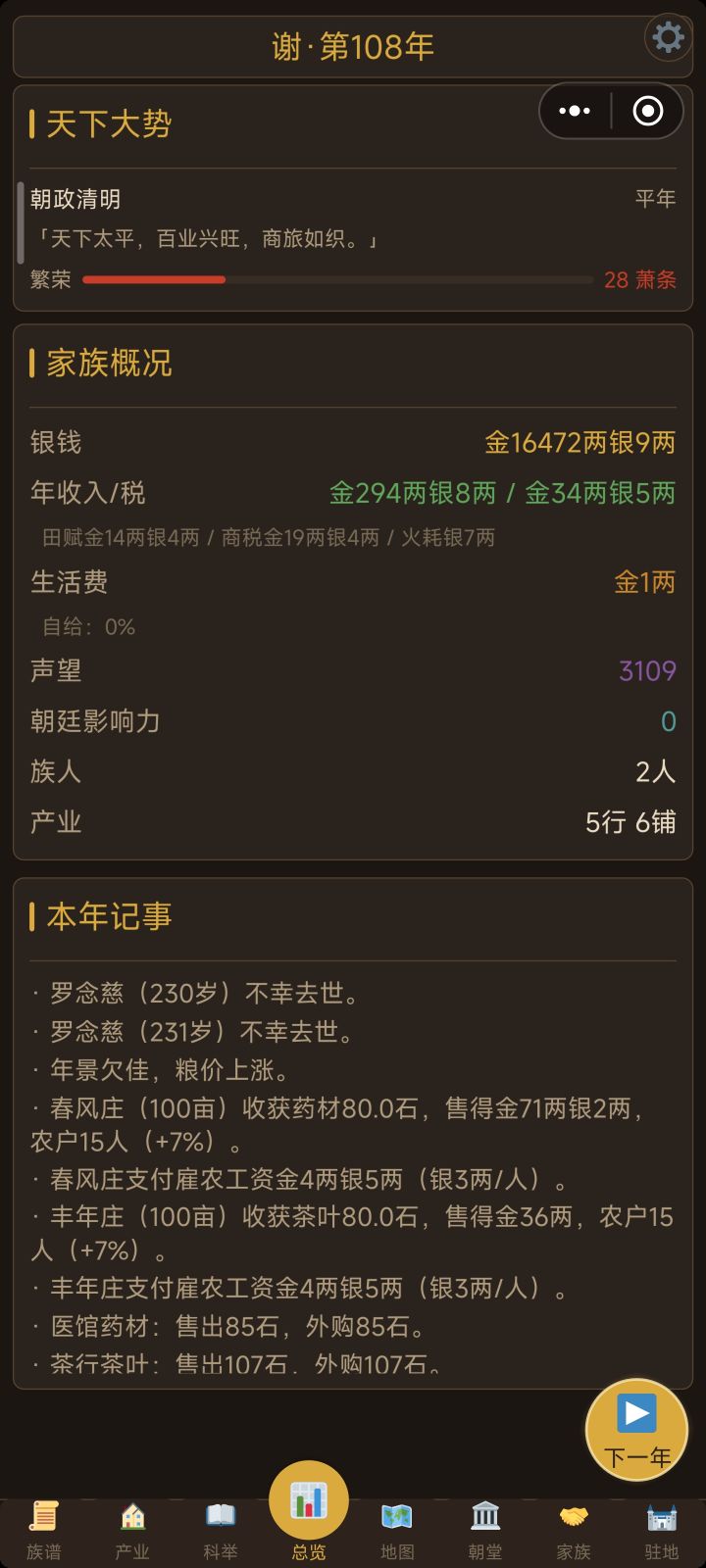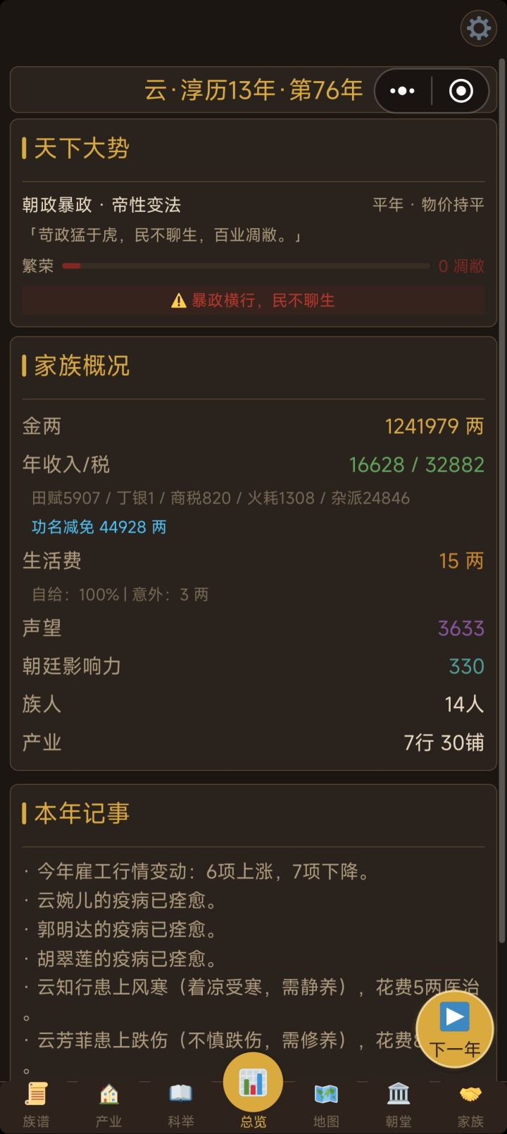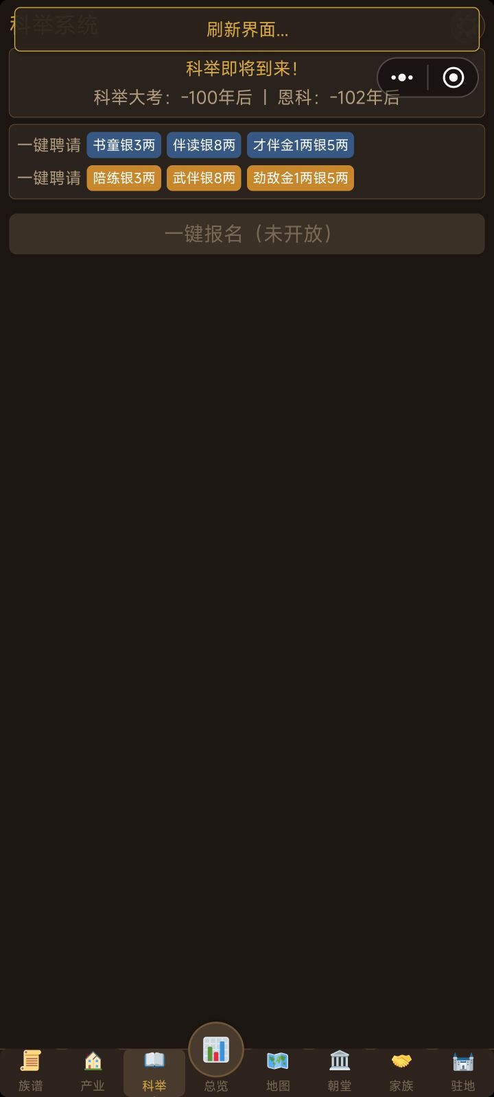 人都死完了,还能继续玩1、科举倒转,越点负的越多2、亲人结婚,还多出了几个同姓名3、人脉世家这两版块都只能点一次,然后就再也点不了4、招赘上门女婿,结果反而出嫁了5、产业模块翻到第二页,点一次刷新一回,频繁跳动