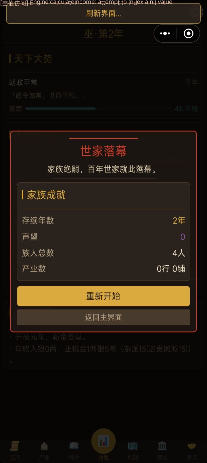 正上方只要不是‘刷新页面’的字面都会闪退,连着TapTap,经过多次的测试发现是关于某个数据的问题,其中遇到就是有的人物当官了你不能在这个回合进行升迁变动,不然下个回合,(显示引擎计算或者同步索引都会闪退,这是目前出发的闪退提示)想要进行变动只能回自己手动存档,什么都不变动的情况进行下一回合,然后就可以变动,但玩个数十个回合或者久一点就还会触发这个闪退机制,还有农田也不建议各位买太多这个也会触发闪