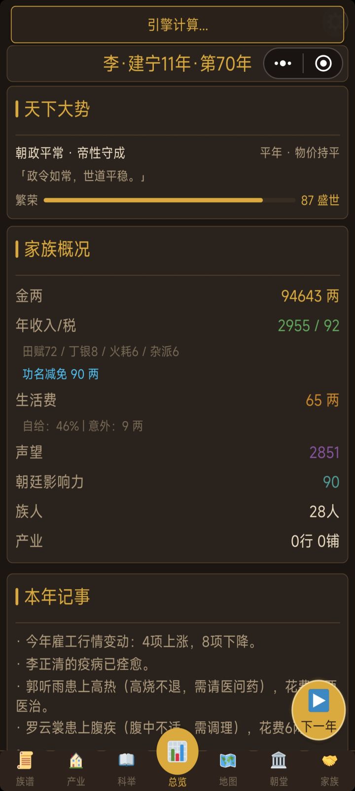 人都死完了,还能继续玩1、科举倒转,越点负的越多2、亲人结婚,还多出了几个同姓名3、人脉世家这两版块都只能点一次,然后就再也点不了4、招赘上门女婿,结果反而出嫁了5、产业模块翻到第二页,点一次刷新一回,频繁跳动