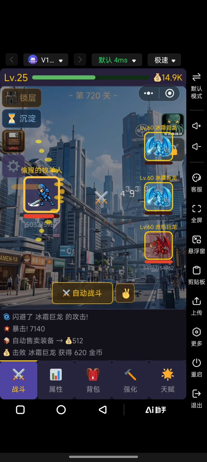 游戏内容比较简单,就是刷刷刷爽爽爽,可以一直挂关卡层数,我俩小时就720层了,需要扣一点细节,不是无脑刷的游戏目前总结了一点经验,等会在论坛发一下