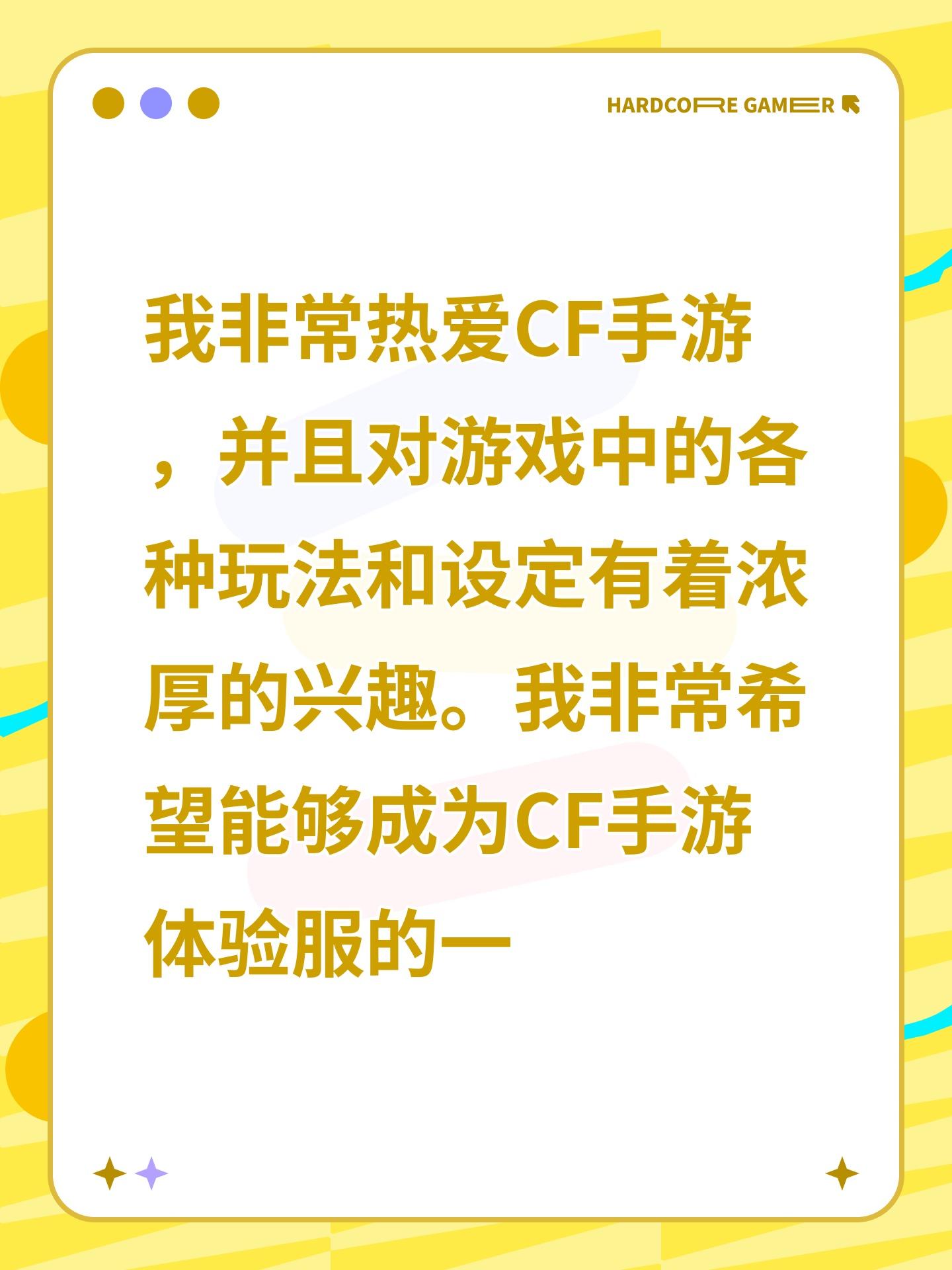 .申请体验服资格 尊敬的CF手游官方团队: 我非常热爱CF手游,并且对游戏中的各种玩法和设定有着浓厚的兴趣。我非常希望能够成为CF手游体验服的一员,以便能够更深入地了解游戏的玩法和机制,为游戏的发展贡献自己的力量。 作为一名玩家,我深知体验服的重要性。在体验服中,我可以提前体验到游戏的新版本和更新内容,反馈问题和建议,为游戏的优化和改进提供帮助。同时,我也可以与其他玩家一起交流学习,提高自己