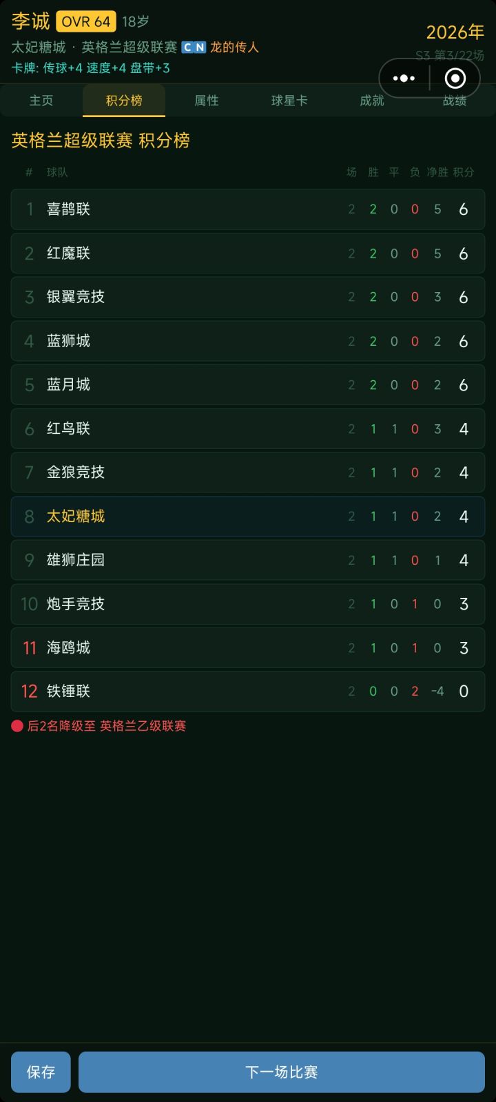 通过不断的比赛来提升自己玩的我有点上头看着积分榜上的其他球队盘盘算着怎么才能打上第一注:游戏需要yi点点运气