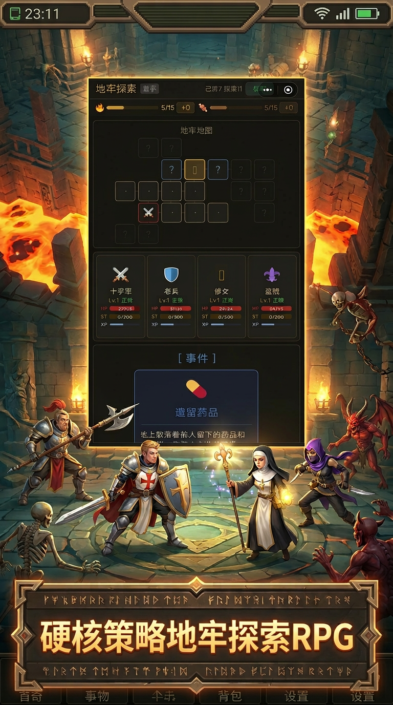 一款硬核回合制地牢探索RPG。招募十字军、老兵、修女、盗贼等英雄组建队伍,深入危机四伏的地牢,面对骷髅弓手、僵尸等怪物的挑战。升级城镇设施,管理装备背包,在策略与风险中求生。