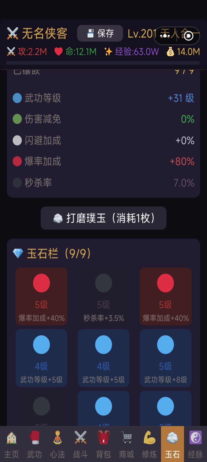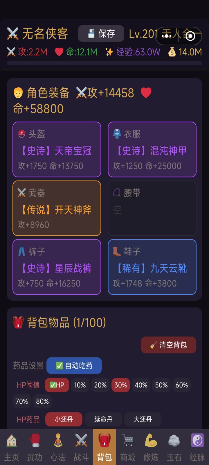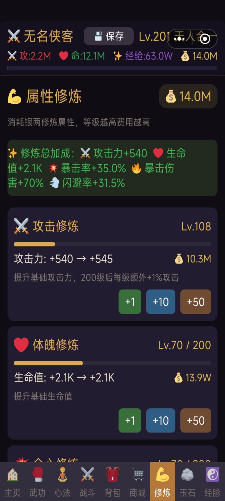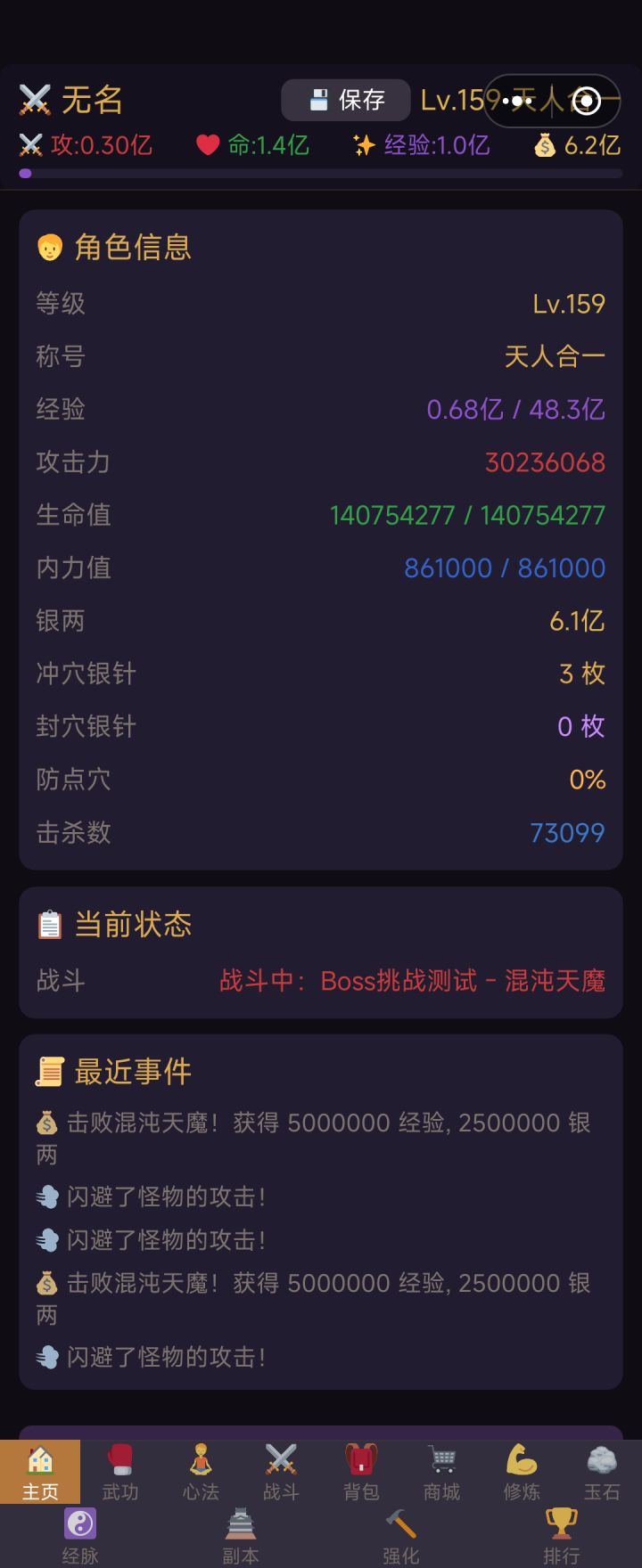 这游戏很不错,简单明了,开局就刷每个地图的第一个怪,啥都有了,跟着等级走,很快就到顶,石头可以刷到5级,武功就刷最后两图,拉满暴击,适当升其他最后都拉满,直接刷更新后的boss图,啥都有,经脉随便点,满了就下一个
