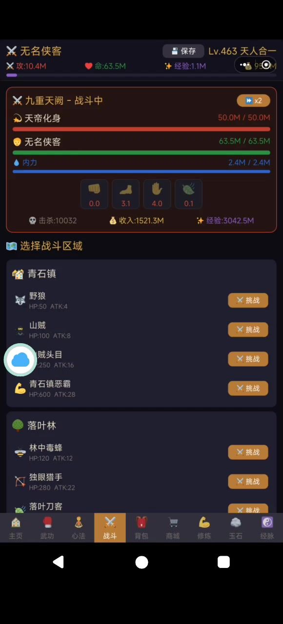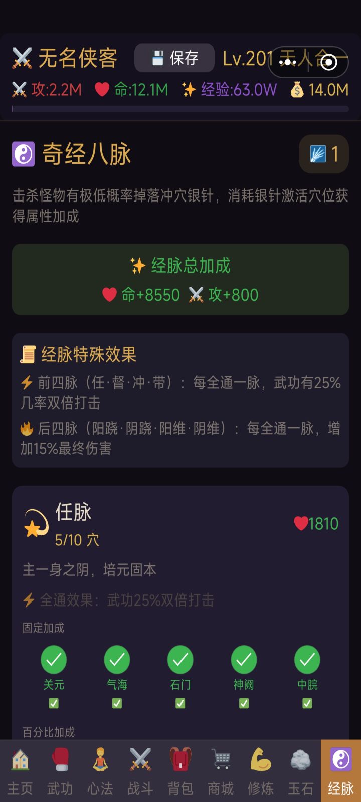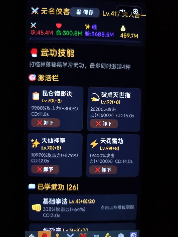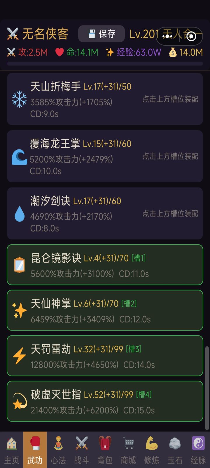 这游戏很不错,简单明了,开局就刷每个地图的第一个怪,啥都有了,跟着等级走,很快就到顶,石头可以刷到5级,武功就刷最后两图,拉满暴击,适当升其他最后都拉满,直接刷更新后的boss图,啥都有,经脉随便点,满了就下一个