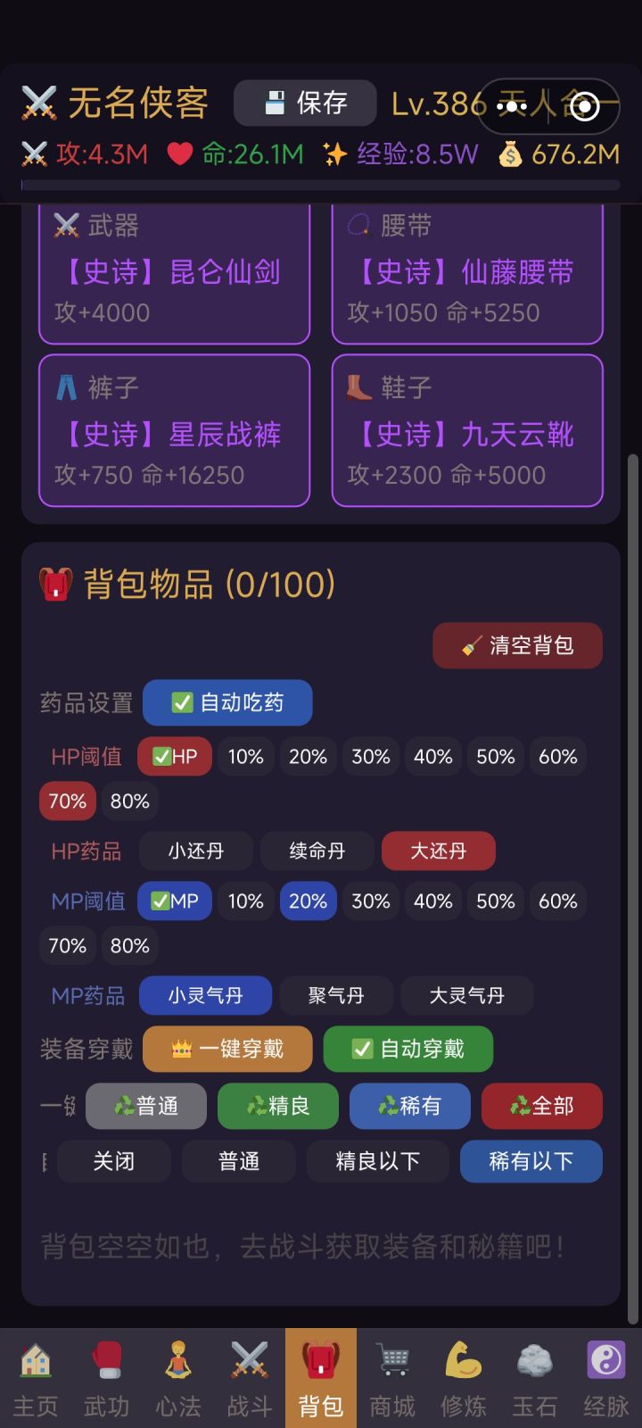 把清空背包删了或者加两次确认吧,我功法没升级,都是刷满了,一下子东西都没了