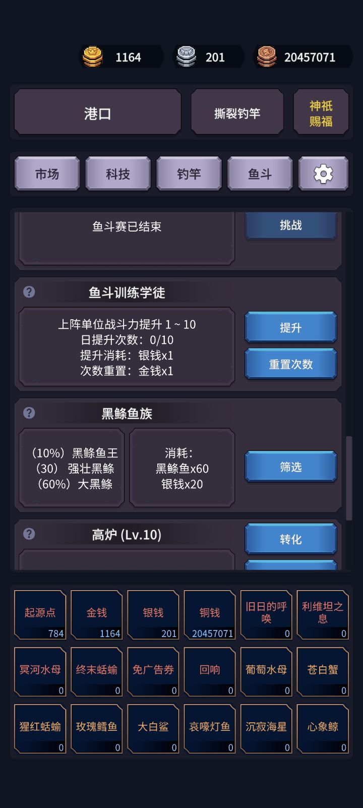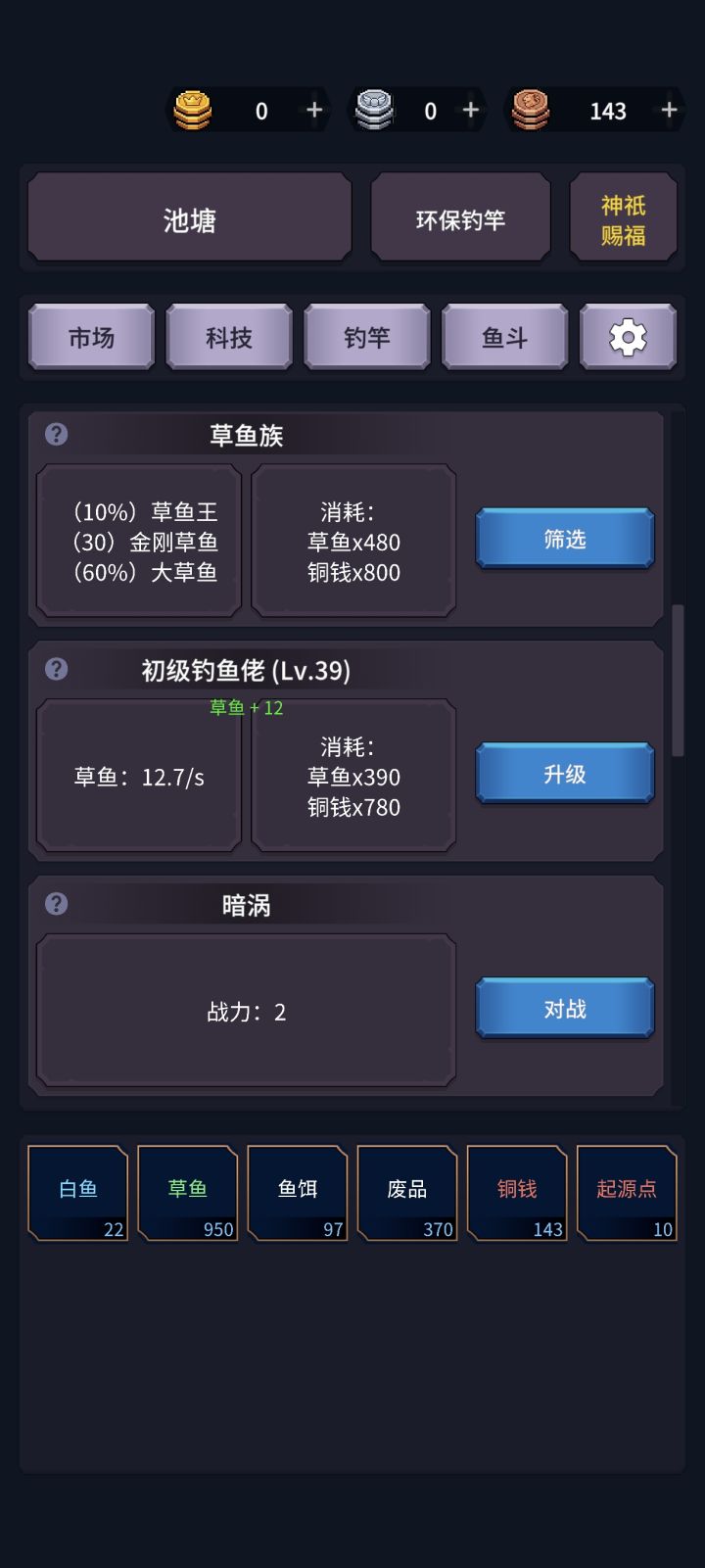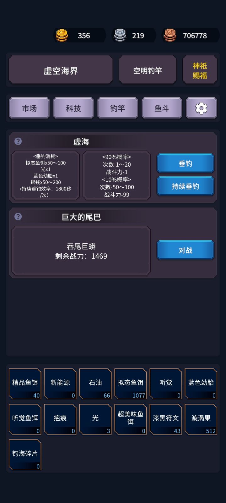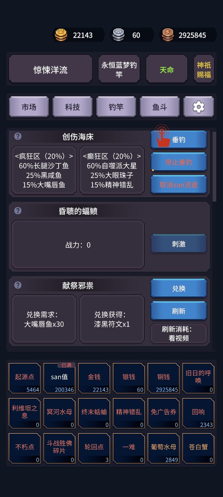 我看群里很多人觉得风暴潮不赚钱,这里讲一下风暴潮不挂鱼饵有三种产出:灯笼鱼500铜币、海星200铜币、葡萄水母1000铜币平均期望收益为:500*0.15+200*0.3+1000*0.05=185减去钓鱼消耗的100铜币,平均每次钓鱼产出95铜币,所以!风暴潮不是赌!是纯赚!!再加个50%垂钓物翻倍的广告,平均产出就达到了185*1.5=277.5减去成本100就是177.5铜币每次垂钓。哪怕纯手点还慢点,一秒点一次,产出效率也堪比522级中级钓鱼佬产出。上科技每秒钓5次就等于2500级钓鱼佬。懂得都懂