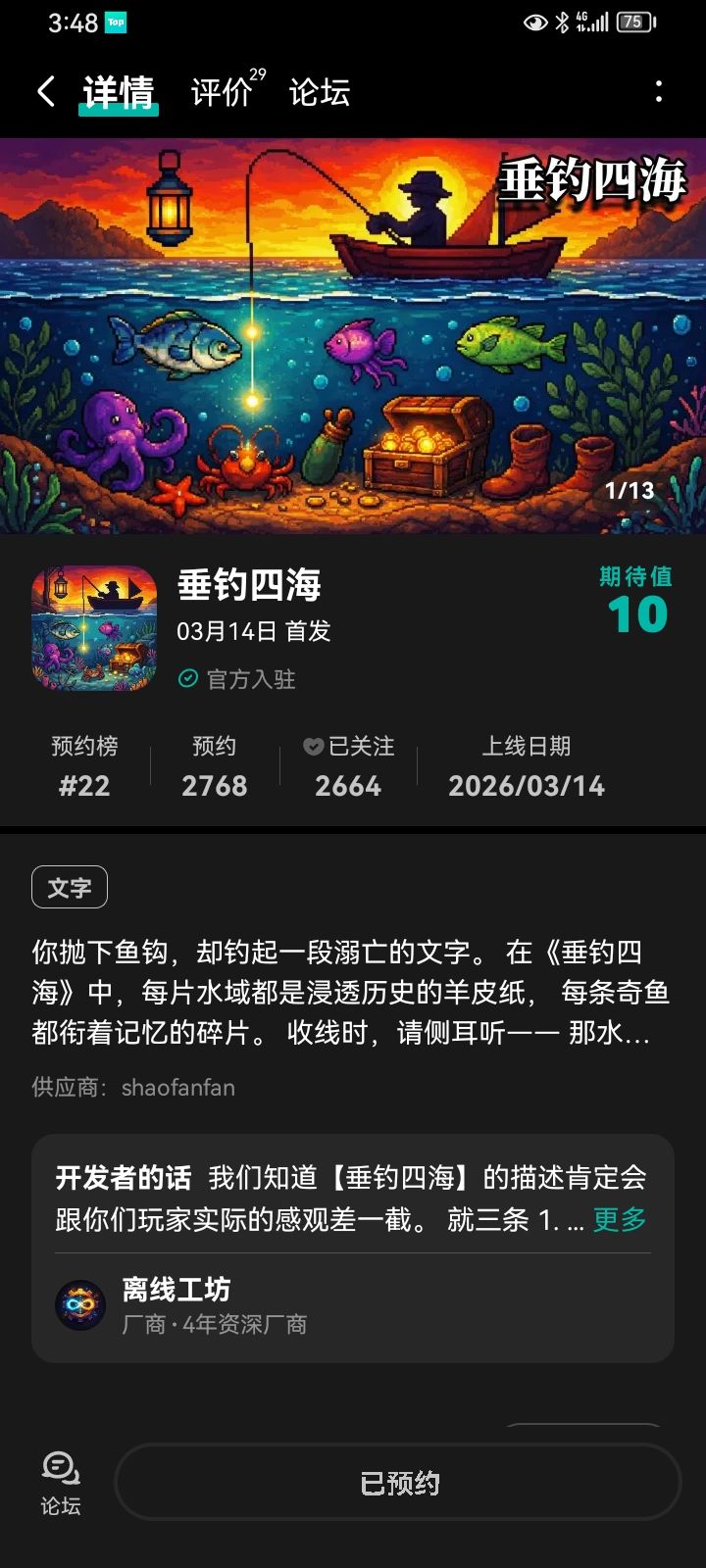 叽叽咕咕的声音:要不是taptap点将,我现在兴许还在送外卖呢。当然了送外卖也没什么不好,但是能在榜单微微跟大佬们靠一靠,可以更加的沾沾福气嘛。⭐️辛苦taptap的审核!⭐️⭐️膜拜taptap的算法机制⭐️⭐️感谢taptap的玩家⭐️让我们的【垂钓四海】能被更多人看到!游戏面对即将来临的内测,公测,只希望对得起所有人。握竿在手,独向漫天,仰天一掷,垂钓深渊!论中式神话与克苏鲁