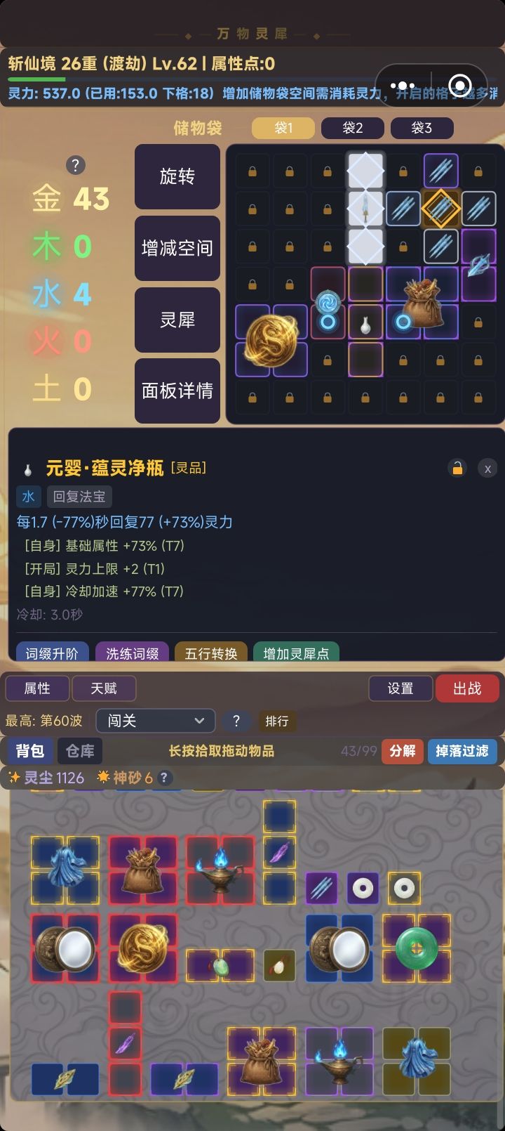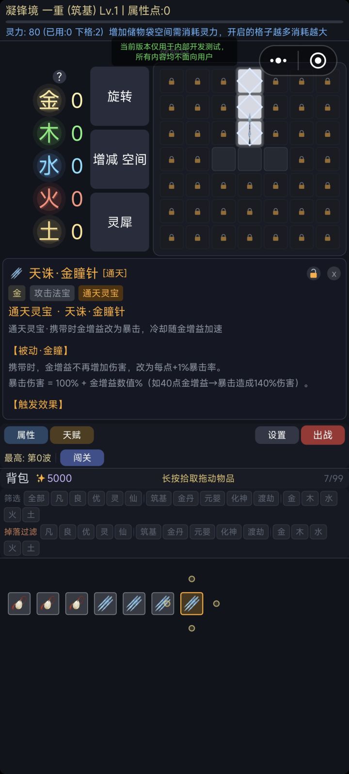 - 清空所有旧关卡,保留1个无限挑战关卡;优化怪物种类,强度随波次无上限提升。- 优化宝物掉落,增加离线挂机收益;怪物强度越高,宝物稀有度与掉落数量越高,46波后高T阶词缀出现概率持续增加。- 后续规划:完善装备系统,新增词缀种类,单独设计带灵犀点的特色装备;开发联机对战,用法宝构筑对打,增设竞技场排名。