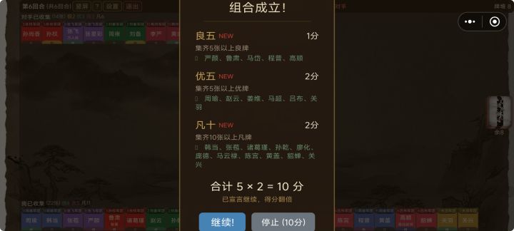 日式花札的规则套在了三国名将身上,开始游戏前有详细的规则介绍,纯文本说明看着有点干涩,不如进游戏体验两把更直观理解规则。易用性做得很好,将牌组进行了编号,找编号就能找到能收走的牌,其次是找搭配牌和极品质的牌,玩过花札的话对规则不会陌生,只是换了个牌面而已。
