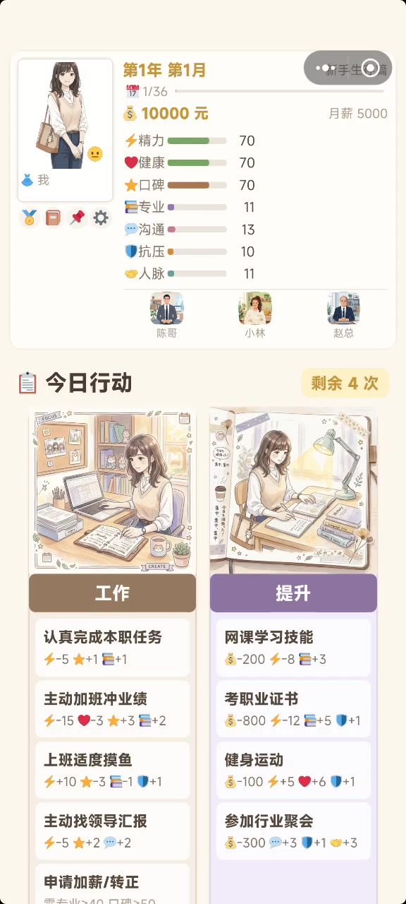各位打工人,新版本来啦!预计在今明进行更新,主要改动如下:四大新系统:挑战模式 — 5 种特殊规则(月光族/佛系/社恐/躺平/速通)+ 每日挑战 + 排行榜副业成长线 — 自由职业/自媒体/投资理财 3 条独立成长路线,各有专属事件,新增 2 个完美结局(自媒体大V、投资达人)条件 NPC 扩展 — 4 位新 NPC(投资人/前同事/行业前辈/自由职业者),各有解锁条件和 24 张情绪立绘