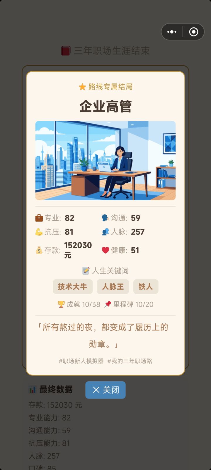各位打工人,新版本将在今日进行更新!新系统:天赋词条通关一次后,每局开局多了一个新环节——5 张天赋卡里选 2 张,带着它们走完整局游戏。每张天赋都是双刃剑,有好处就有代价!当然,你也可以选择跳过,不带任何天赋玩经典模式。新功能:结局分享卡打出结局后,点「生成分享卡片」,会自动帮你生成一张好看的人生总结卡。截图发给朋友,比比看谁的职场路更精彩。新功能:人生对比游戏会记住你最近 1