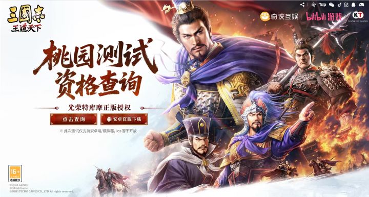 战鼓声声,汉末的烽烟已在天际燃起。由光荣特库摩正版授权的沙盘策略新作《三国志:王道天下》「桃园首测」即将正式拉开帷幕!测试信息测试时间:2026年3月28日10:00起预下载时间:2026年3月26日12:00测试类型:不计费删档限号测试测试平台:安卓&模拟器测试参与方式为了迎接各路豪杰,本次测试将同步开启两大服务器:【桃园结义】 与 【同心同德】。参与测试有两种方式: 1、 测
