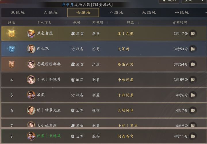 从上午10点开服至今,前期试验了好几个开荒将,到20级的时候才确定下来比较稳的开荒阵容,现在跟大家分享一下,首先3/4/5资源地,这个前期送的主公+任意1输出,比如太史慈、乐进、张飞、马腾、然后配个奶都很容易过度,关键节点在中午12点左右开6的时候,这个时候主C(除了甄姬、主公外的输出)从排行表现来看,赵云、吕布、袁绍、都能胜任。战法如图,20级就可以去莽一下了,(排名有金珠奖励),从排行榜来看,
