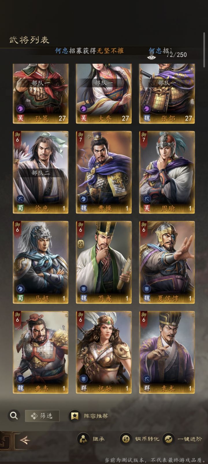 开荒前最重要的一步!抽卡!选好洲以后直接点击邮件领取2.5W黄金一共320抽,并且附送一个开荒神卡奶妈:甄氏将 2.5W 黄金全部抽掉,运气好可以出甄氏的上位替代以及后续要用的3号位输出武将前期用初始自带的武将卡: (主公+甄氏) 即可轻松开荒 配队逻辑队伍中存在(御值)设计,部队武将的御值总和不能超过队伍里(御值)的最大值,随着游戏进程(御值)的最大值会越来越高,开荒阵容也会持续迭代
