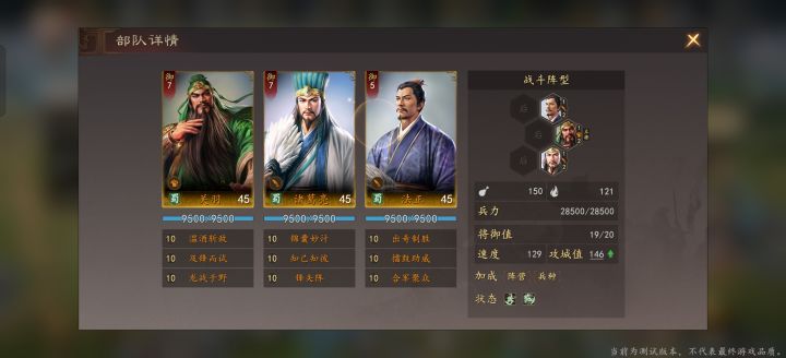 战法搭配如图,没有概率全是极致的数值!唯一怕的也就是一手周瑜弓,不过骄兵给到周瑜和孙策周瑜弓也白给!这里法正要调速调到一速。