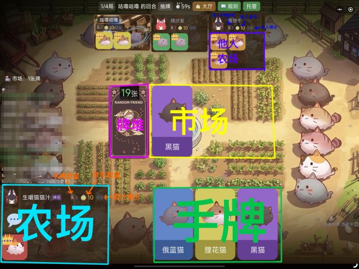 先介绍一下页面(不看也行)看不懂没事,跟下文结合起来看(名词注释:牌就是奇蛋)玩法:你的每回合就做两件事:抽一张牌,出一张牌。抽牌阶段(二选一):1 盲抽:堆顶摸一张未知的牌,但要付钱,费用等于市场上牌的数量2 拿市场牌:直接拿走市场上的一张牌,并立刻获得它上面放的所有金币出牌阶段(二选一):1 饲养:亮出一张牌到农场,如果你亮出的这个牌是场上最多的,你就是农场主2 放市场:打