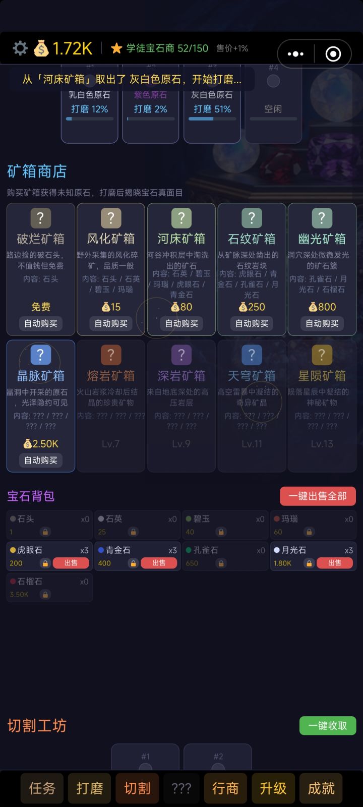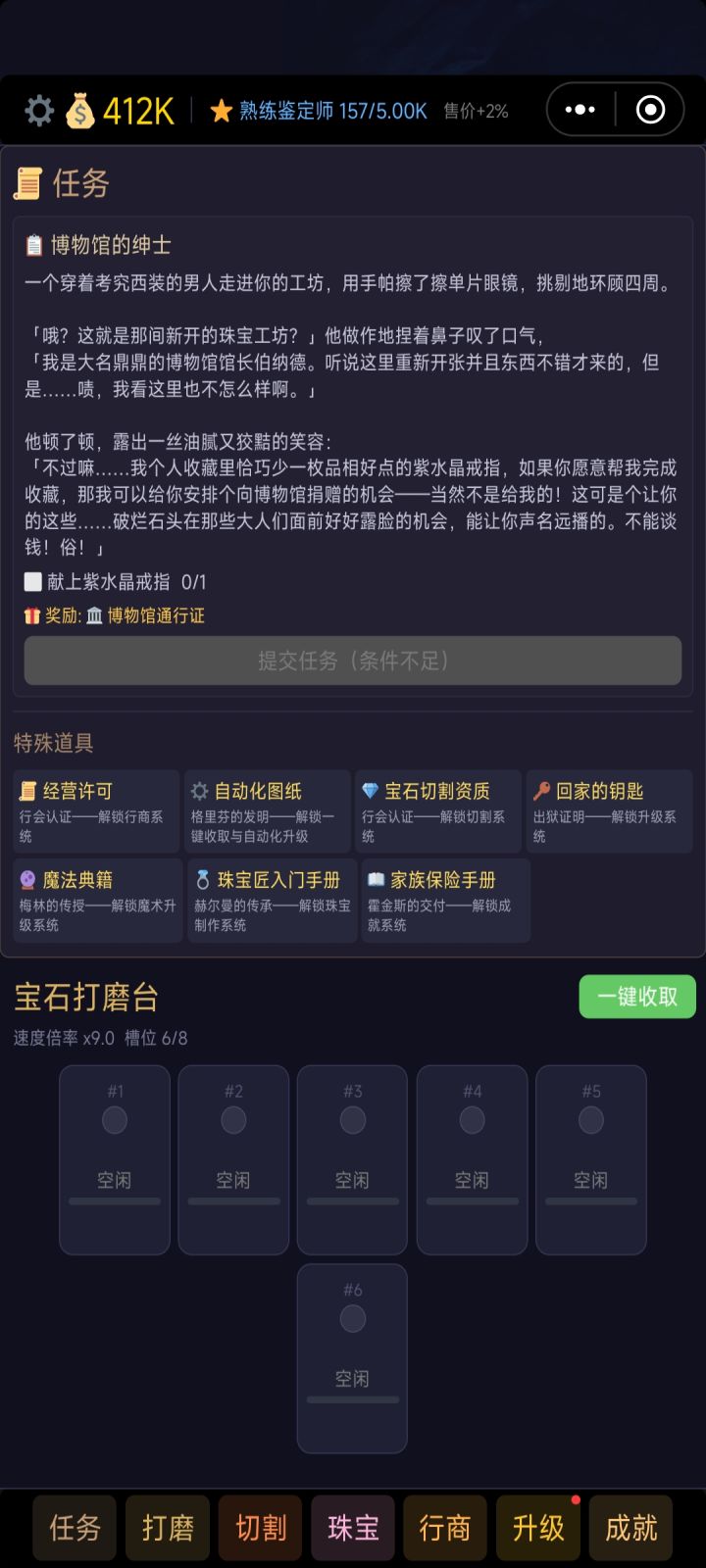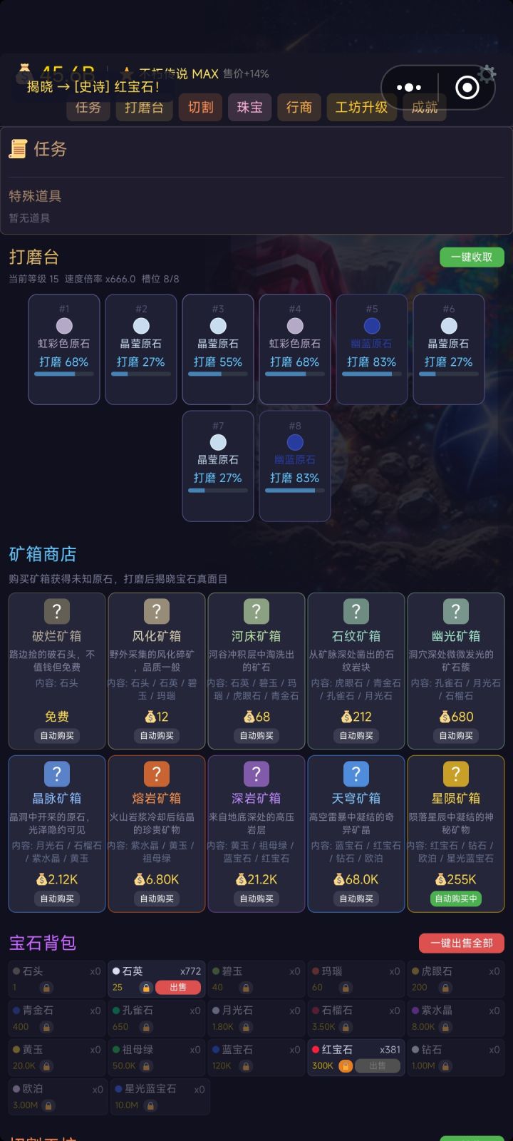 1. 优化移动端界面,放大部分字号,提升可读性2. 调整珠宝制作按钮位置,操作更便捷3. 优化游戏 Logo 视觉效果4. 移除「自动出售」自动化升级及对应成就条件5. 新增更多订单过滤升级选项6. 切割宝石背包现已可以折叠收起7. 其他更新和优化