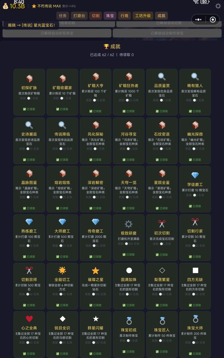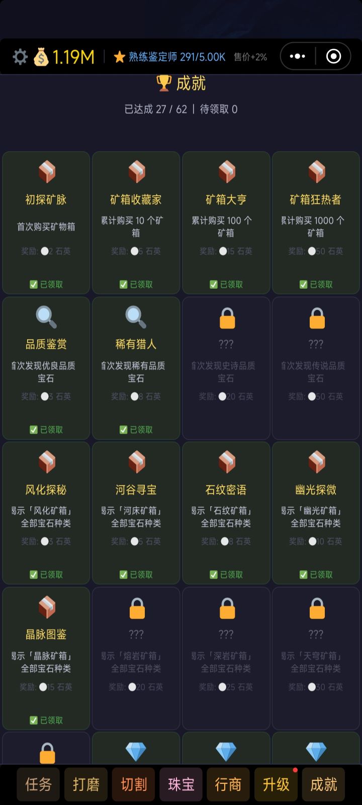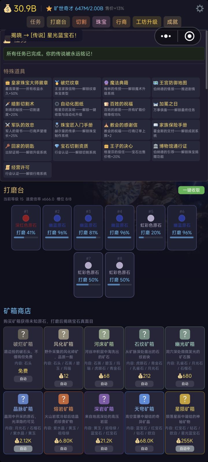 1. 优化移动端界面,放大部分字号,提升可读性2. 调整珠宝制作按钮位置,操作更便捷3. 优化游戏 Logo 视觉效果4. 移除「自动出售」自动化升级及对应成就条件5. 新增更多订单过滤升级选项6. 切割宝石背包现已可以折叠收起7. 其他更新和优化