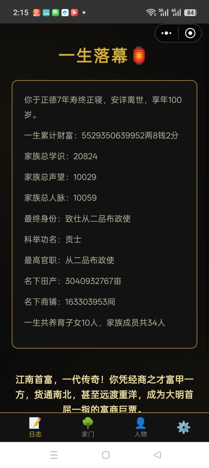 正德七年,百岁寿终,安然离世,一生落幕。自入仕以来,以贡士功名登朝,官至正三品六部侍郎,致仕荣归,朝堂留名;于商海之中,凭卓绝之才富甲一方,坐拥三百间商铺、万亩(近)良田,货通南北,远渡重洋,成大明一代传奇巨贾,一生聚财三百五十七万余两,富可敌国。家族文脉绵延,总学识七千余,声望、人脉皆破万,誉满江南;育子女七人,家族十六口,子孙绕膝,福泽绵长。百岁人生,仕商两旺,福寿双全,富贵加身,留万贯