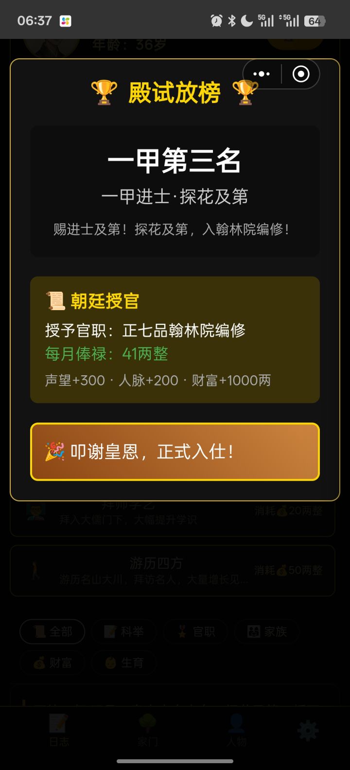 BUG①从九品——巡检(游戏中的理论第二低官职)我不知道是不是没做完还是说卡bug了,好像捐纳完600两之后只有个提示,根本没有授予官职,我甚至可以重复捐纳,然后触发这个提示(如图1),感觉就是在⭕银两,不管你是童生还是秀才,捐纳完都无法被授予官职。BUG②未入流——教谕(游戏理论最低官职)正九品——县主簿(游戏中的被隐藏的官职)如果在中举之后选择当官,理论上会被授予该官职,但实际会直