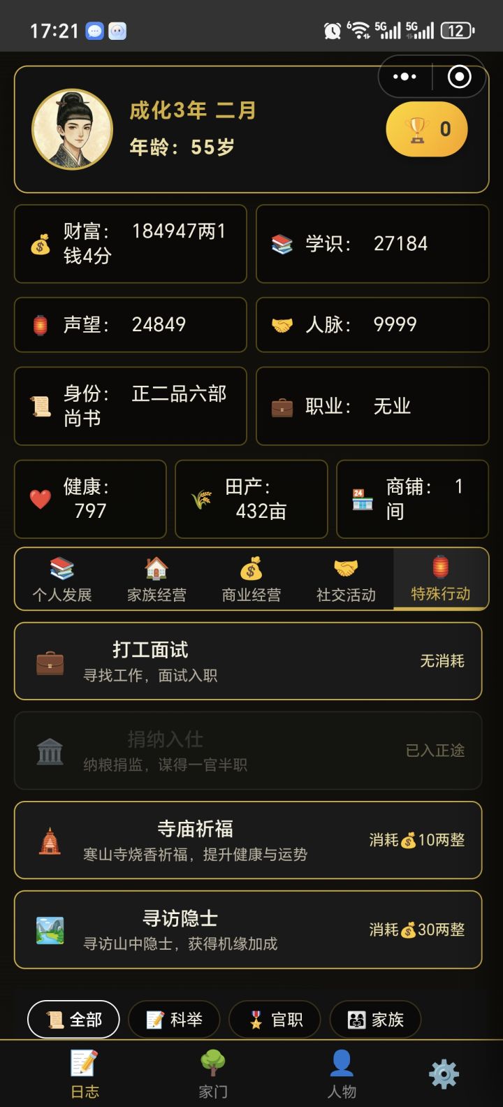初始Roll点,学识80以上,声望人脉各60就差不多了,每月点修身养性加健康,快的话6个月,慢的话9个月健康就450了,中间考试不要主动点,过月时会自己跳事件,初始点数足够过两次童生试。辞职,直接面试总镖头,总镖头需要健康450,声望60,人脉50,每月6两6钱,就是掉健康比较多。每月写对联,加上总镖头,大概月入10两,4个月就能买田,然后照料田地,凑够200两买瓷器铺,再凑个200多两就可以南北