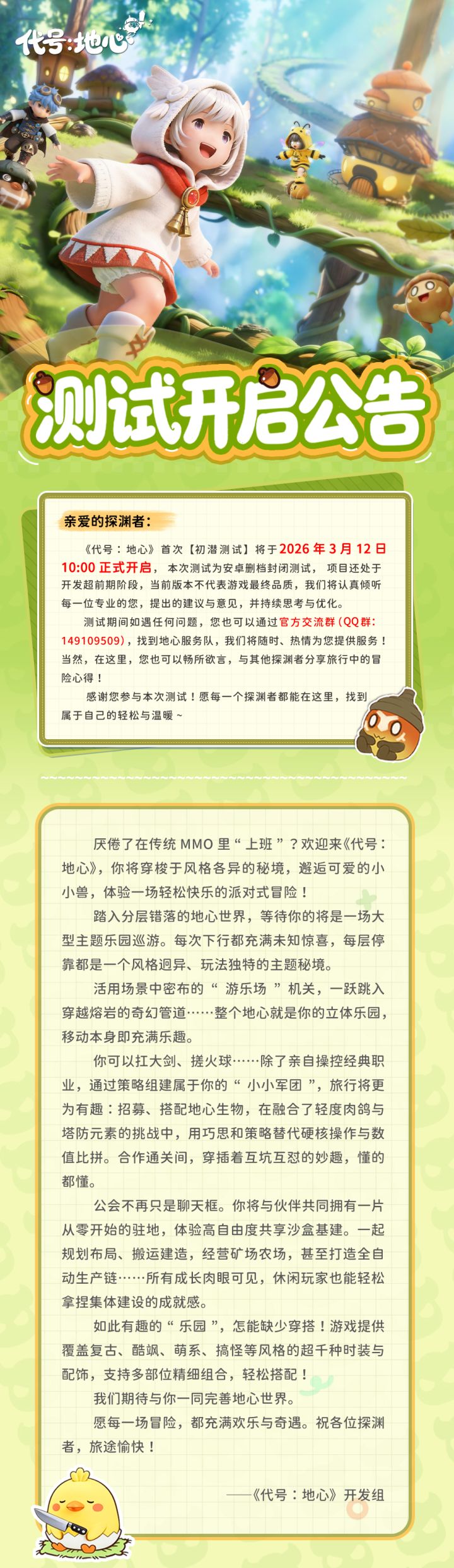 亲爱的冒险者,大家好~ 我们是《代号:地心》的开发团队。在MMO领域深耕多年,我们亲眼目睹了这个品类如何从只有组队打怪,演变成涵盖剧情、副本、PVP、GVG、家园、吃鸡、搜打撤……等丰富内容的“庞然大物”——从一个简单的社交冒险概念,逐渐演变成一个庞杂的“数字社会”。 它似乎无所不包,却也让人无所适从。上线像上班,玩法像赶场,沉重的日常负担、激烈的数值内卷和复杂的社交压力,也让许多原本只想寻求