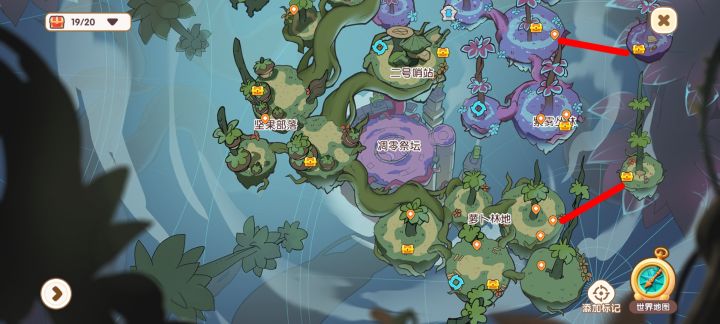 连线的两处是要跑酷跳跃平台的 红色怪物标志是小蜜蜂所在处(废弃哨站处的那个小蜜蜂不知道为什么完成不了 所以显示左上角少一个)单点标志是探索事件:其中有两个是需要旋转指针的,只需要旋转成图那样冒蓝光就成功了 一共有四个有个被封印的宝箱是需要把旁边的小怪全打了就行