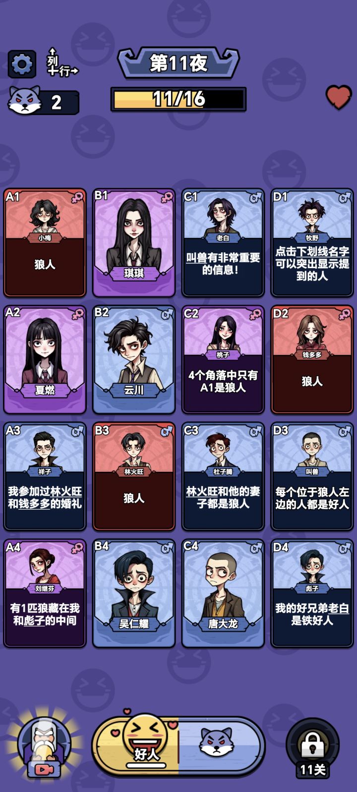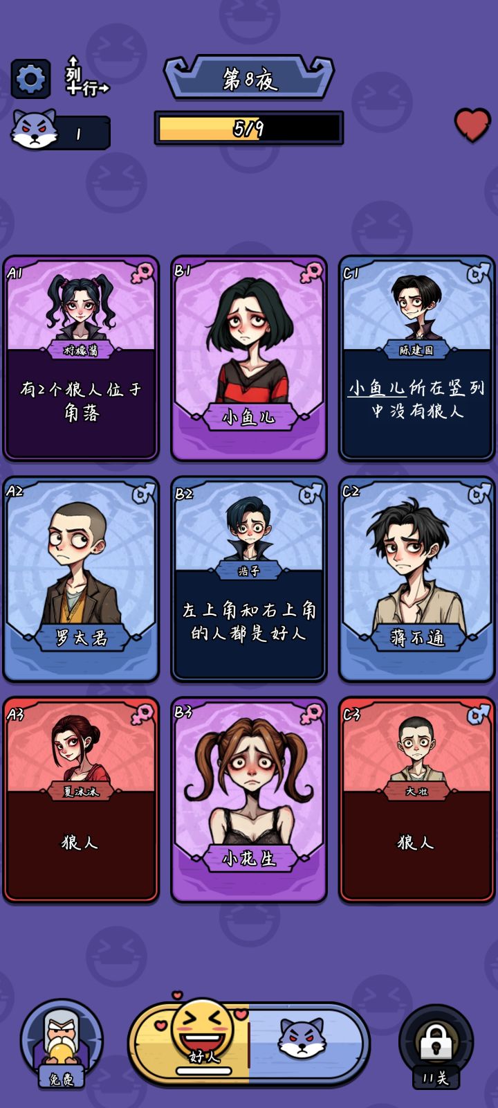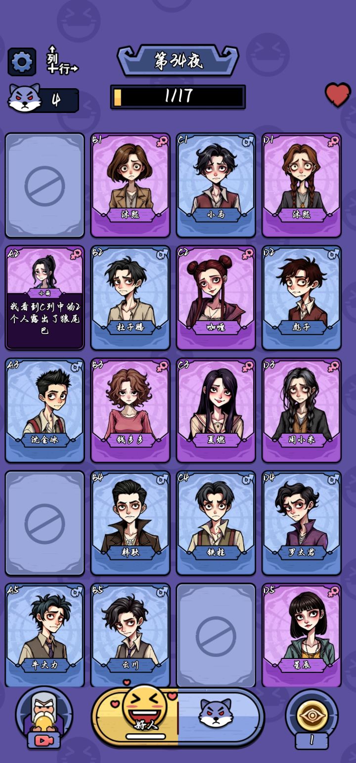 玩法很简单,类似狼人杀的纯文本逻辑判断,将所有狼人都揪出来即可完成关卡。判断过程需要按一定顺序进行,顺序不对有可能通关失败,感觉像是bug一样。横排和纵列每关都有些差别,判断逻辑是一样的,需注意看题。有比较详细的操作引导,上手很容易。