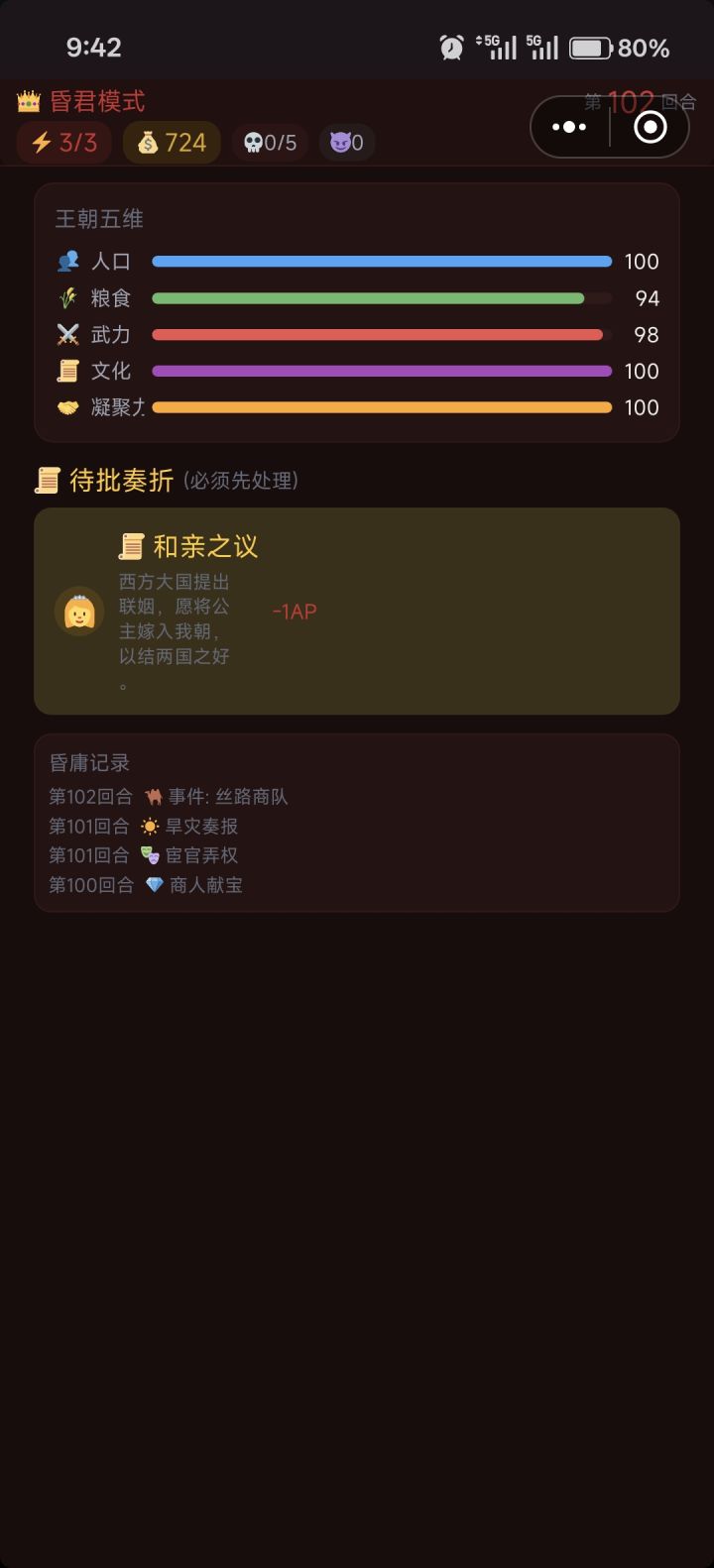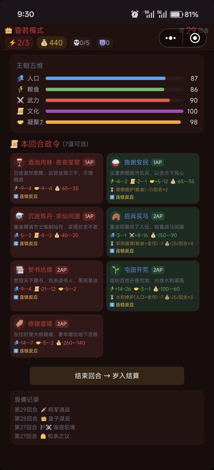 从唐开始随便一个政令都要扣武力…哪怕是选了每回合+武力的专精,也根本不够扣,然后到了宋,武力扣差不多了,想硬刚金国哪怕是骰出了大数,也大幅度扣武力…最后死于武力清0,难绷