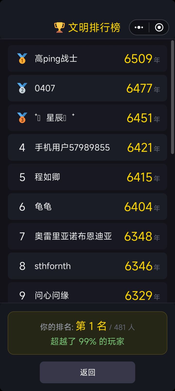 完结撒花,咋说呢,就是一部中华文明进化史。这游戏重点就是平衡五维,大时代的五维进项和游戏过程中获得的五维进项能平衡递增,之后的大乱世时代就要看你在历史上的认知了,就好比清朝末到改革开放前的历史都有在里面进行选项,我是在五维差不多都是80就一直闯到改革开放完结,最后的五维也是掉到了二三十这样