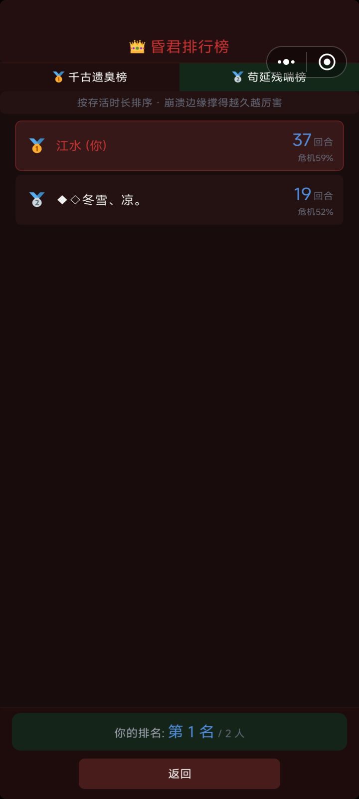 最开始主意到这个榜的时候以为要励精图治。打了两把发现这个榜最难的一步在于入榜,要求在50%的回合里有三项属性值低于30。 相当于就是败家,但是不能败死了这种。 一直在低水平走钢丝。不过我有个问题是凝聚力算不算这三个属性里的,为什么凝聚力见底之后不会立刻亡国。而且有一局里,人口和粮食空了也没有立刻亡国,这些是怎么判断的。