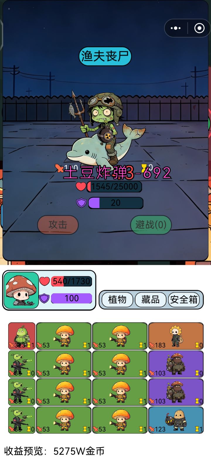 除非后面出更高的物品。不然我这应该是最高的价值了。3个小时通关。别看图二我的血比较少。但是怪打在我身上根本不破防。我来说说我这个流派。3级土豆雷,可以使冷却时间为二的植物攻击时造成血量50%的伤害。三级太阳花,血量提升两倍。一级蘑姑,冷却时间为二,满足土豆雷条件,可以稍微加一点血量。巨力窝瓜没有的话可以随便找一个一格的都行。如果伤害想提高的话,就得找窝瓜。图中我只有一个窝瓜。是因为我只找到