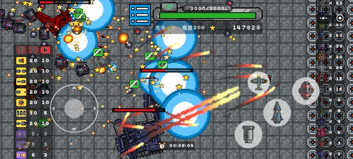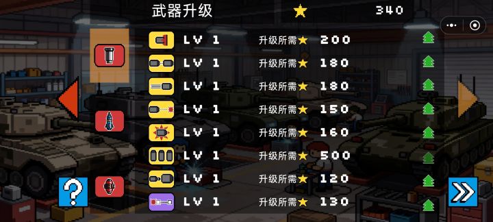 2D像素画风,界面结构简单,UI品质一般。己方战车只有一台,敌方战车种类很丰富,直升机、蜘蛛机甲等都有,也有体型很庞大的多部位战车,有一种遇到BOSS的感觉。