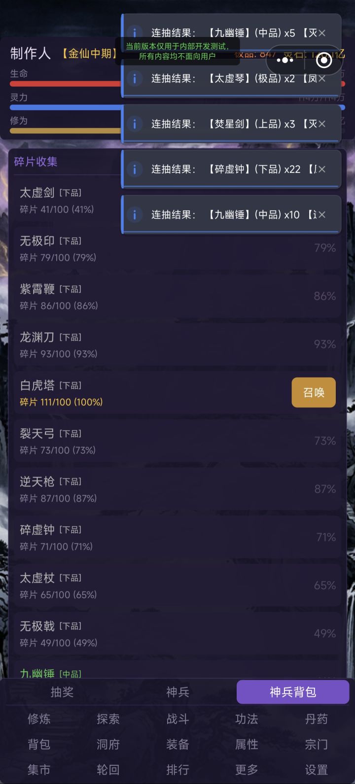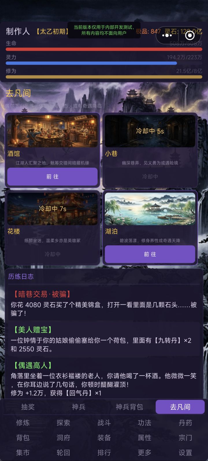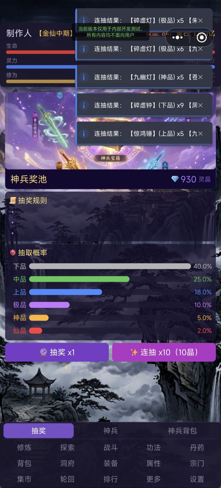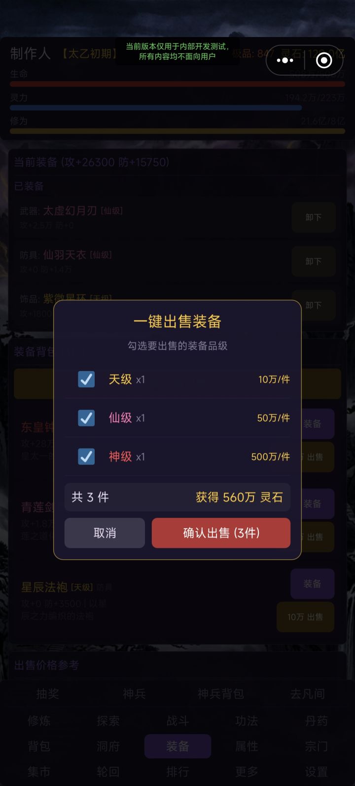 1. 增加神兵抽奖反馈画面,增加满足感与荣誉感2. 测试版数值方面没做!!后面统一会修改,不要再一直问我为什么有的数值不对劲求求你们啦3. 神兵的属性都提高10倍(没啥用)4. 装备按照品质从高到低排序,在页面额外增加一键出售选项和确认弹窗。5. 增加“去凡间”UI,玩家可去往多个人间地图触发随机剧情(有奖有罚纯随机)6. 测试版只做玩法和找bug,目前玩到的都是类似开挂的版本,欢迎来玩