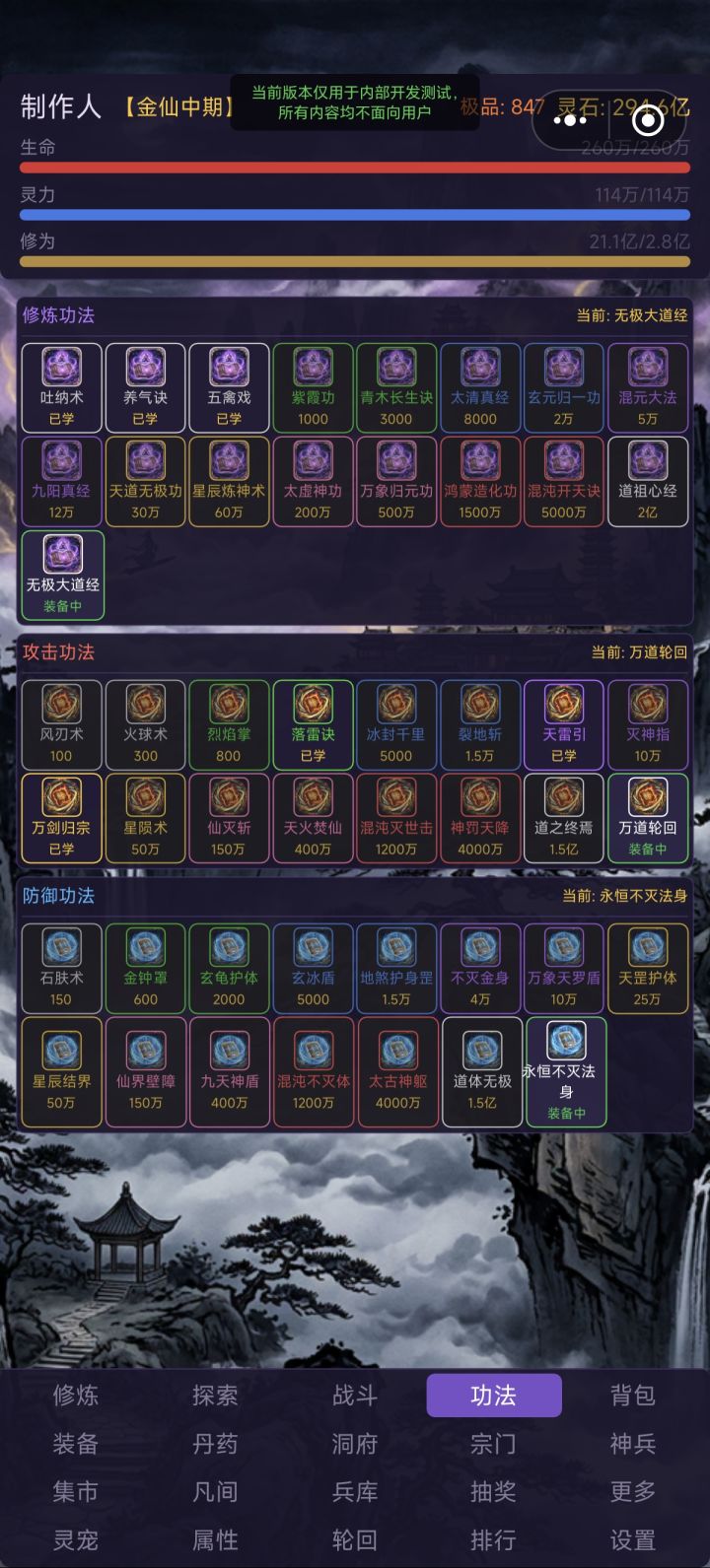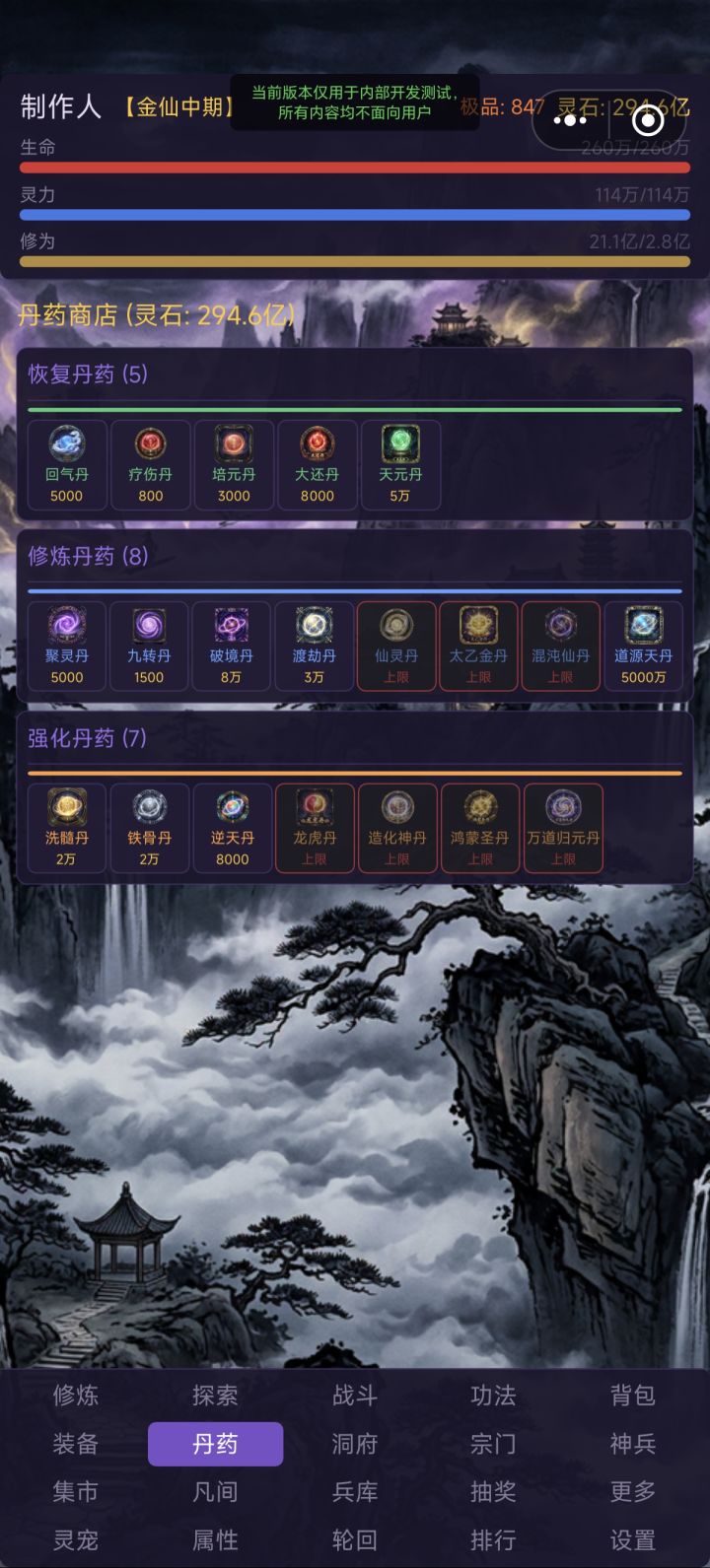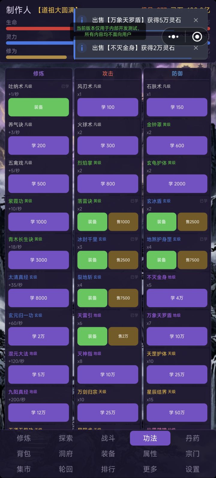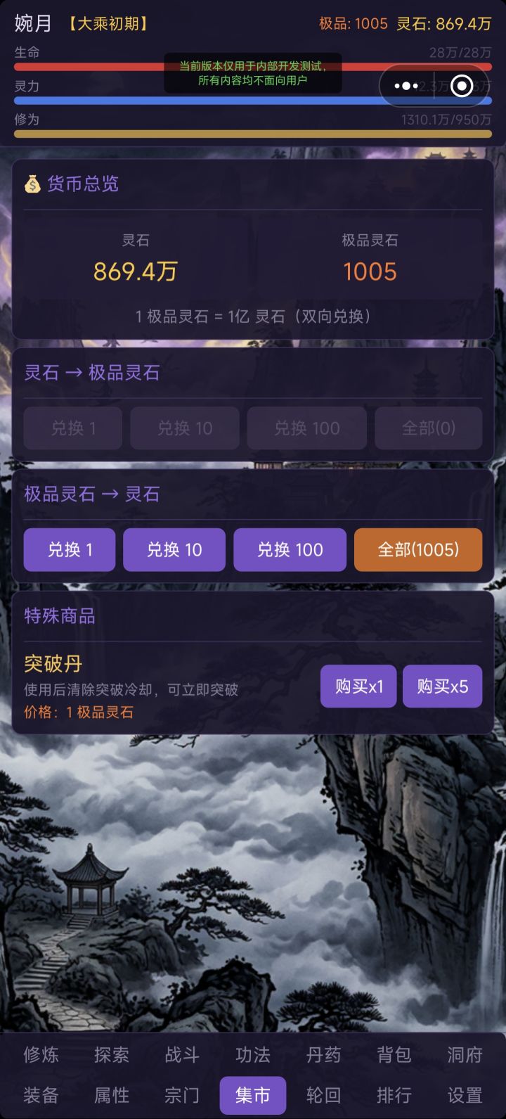 1. 增加自动战斗时灵力不足自动吃回灵力丹药的功能,如果背包没有,则自动花灵石购买2. 增加背包丹药可以选择数量使用的选项3. 优化轮回后增加的属性不会叠加的问题4. 增加背包丹药每天最高使用次数上限(恢复类和修为类无限制,增加属性类最多用20)5. 设置新货币“灵晶”,用100极品灵石可在集市兑换,同时设置双向互换的功能。(测试版,对缺灵石的新玩家来说比较难以参与,所以我会在群里发兑换码