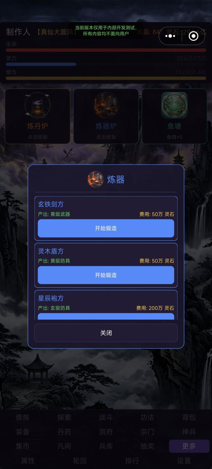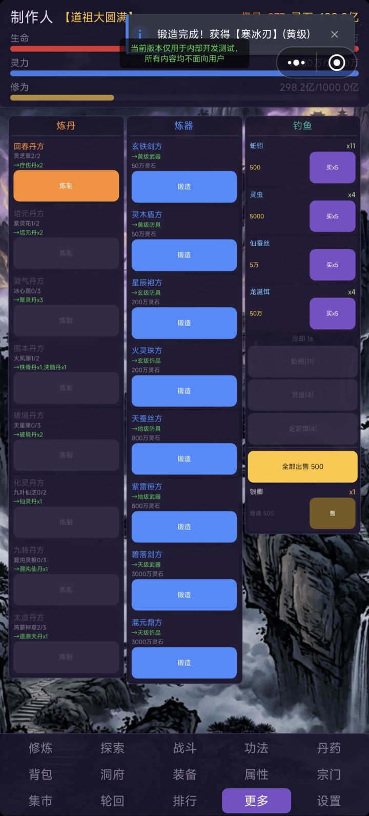 1. 增加神兵升星的功能,多余的碎片可以升星,增加更多属性2. 数值方面还没做别再问为什么属性不对了啊啊啊啊回复很多次了。3. 增加更多“凡间”的剧情对话,会遭遇更多事件了4. 优化底部UI排列5. 优化丹药样式,不再单独显示文字,点击图片出现弹窗后选择使用,也能看到丹药详细信息6. 炼丹与炼器和鱼塘布局全部重做!在炼丹炉与炼器炉那里玩家点击“炼制”,可以自选需要炼制的东西,钓鱼桶里点击