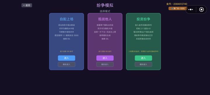 版本更新时,老玩家进入游戏时请退出重新!!才能玩到新版本。如果在旧版本中进行了一些操作,到了新版本你的种种操作都会丢失!!! 本次更新如下:1.添加更大容量的纷争模拟(富)排行榜。(因为出现过高的财产是会导致变为负数)2.添加每日纷争模拟(日)排行榜,每天刷新3.优化无尽模式的性能4.添加广告获取金币方式