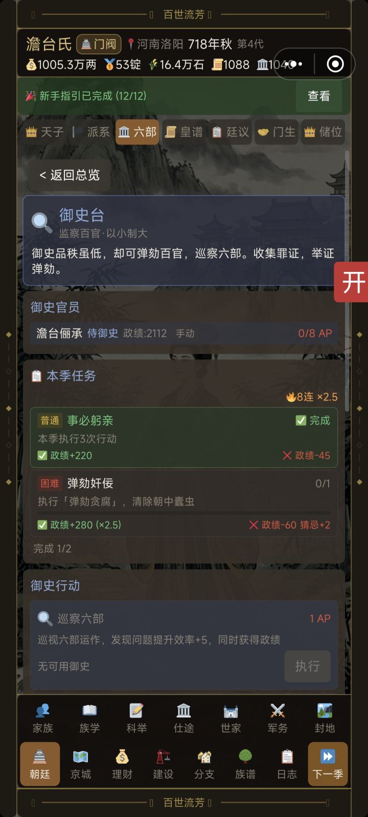ok啊,摸上这个游戏我也是不知不觉玩了有七个小时左右,也总结了一些经验怎么赚钱,大家也可以参考一下。首先给萌新介绍一下(如果都懂可以直接看下面的攻略):首先对于开局的六属性文韵,商业,谋略,武艺,魅力在科举中都有计算占比的,从军路线看武艺和谋略,大部分介绍都可以打开工具箱的游戏说明看。朝廷前期不用管,仕途主要是看入仕的族人和对其的操作,世家就是看其他的npc世家,日志是看这一季都发生了什么。—