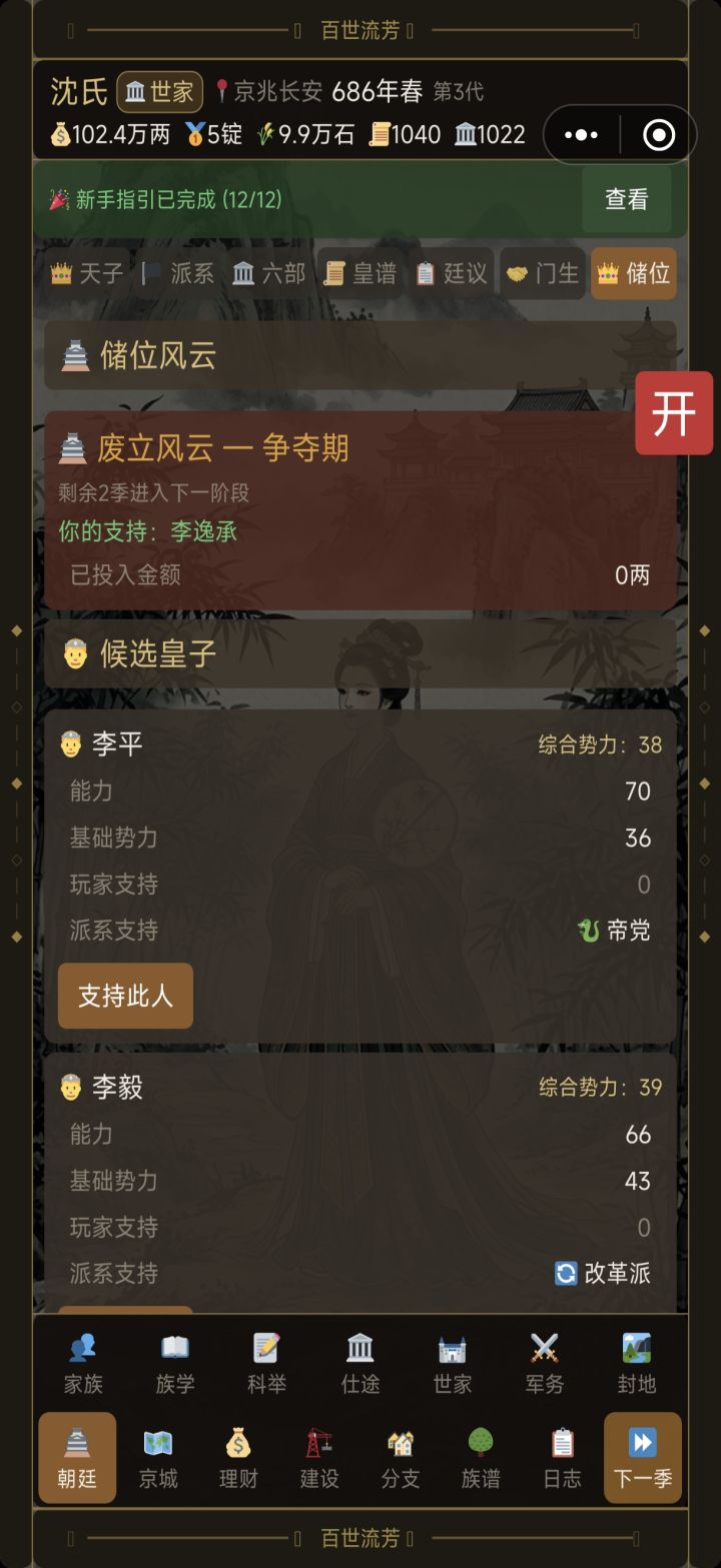 我还得补充一点东西,上面篇幅有限,第一轮你做完之后,手里头的钱肯定有很多了,先把商铺点满,这个时候就可以靠产业收入和建设收入养活家人了,这时候就可以放心地去投资,然后我们sl一个甲级老师,教的主要是文韵,谋略,商业,武艺都可以,好像武艺也有科举的计算占比,刷好之后就雇佣,给族人上课,科举也可以sl。后面入仕了想升得快得用很多钱,不过对于我们这个流派来说,到时候就是毛毛雨。基本15000一次就可以把政绩叠满,页面不知道各位看不看的懂,我也不好描述,有人问我再详细说。