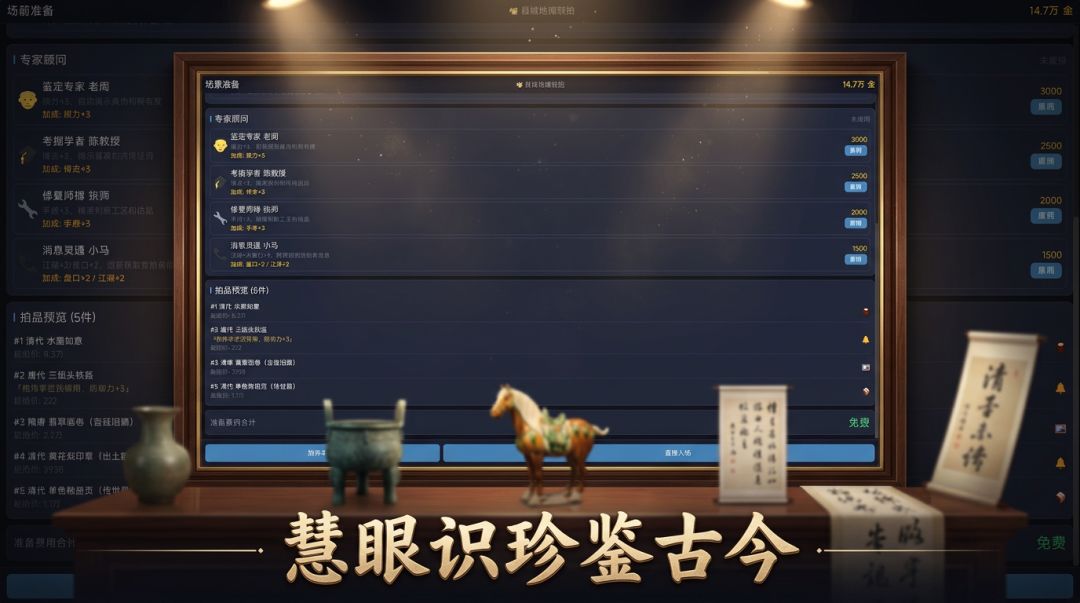 台上那个青花罐,摊主说是康熙年间的。你盯着看了三秒。朝代词条显示:清代早期。材质词条显示:瓷。真伪词条——被挡住了,你技能不够。旁边那个西装男已经举牌了。跟,还是不跟?这就是《拍卖大亨外传之鉴宝大师》的日常。你是个古玩掮客,不是专家,不是收藏家,就是个想低买高卖赚差价的普通人。每局揣着一笔启动资金,穿越随机生成的拍卖场,靠眼力、靠道具、靠对满场对手行为的死命揣摩,把被低估的东西买进来,再把它卖给愿意多掏钱的人。