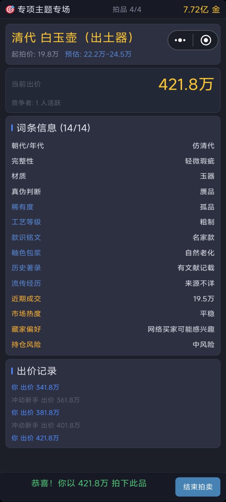 还有很多问题,功能还有很多没实装的。然后你只要点开始拍卖加个价点放弃就自动能拍成功。所以只需要场外看看是不是真假就行