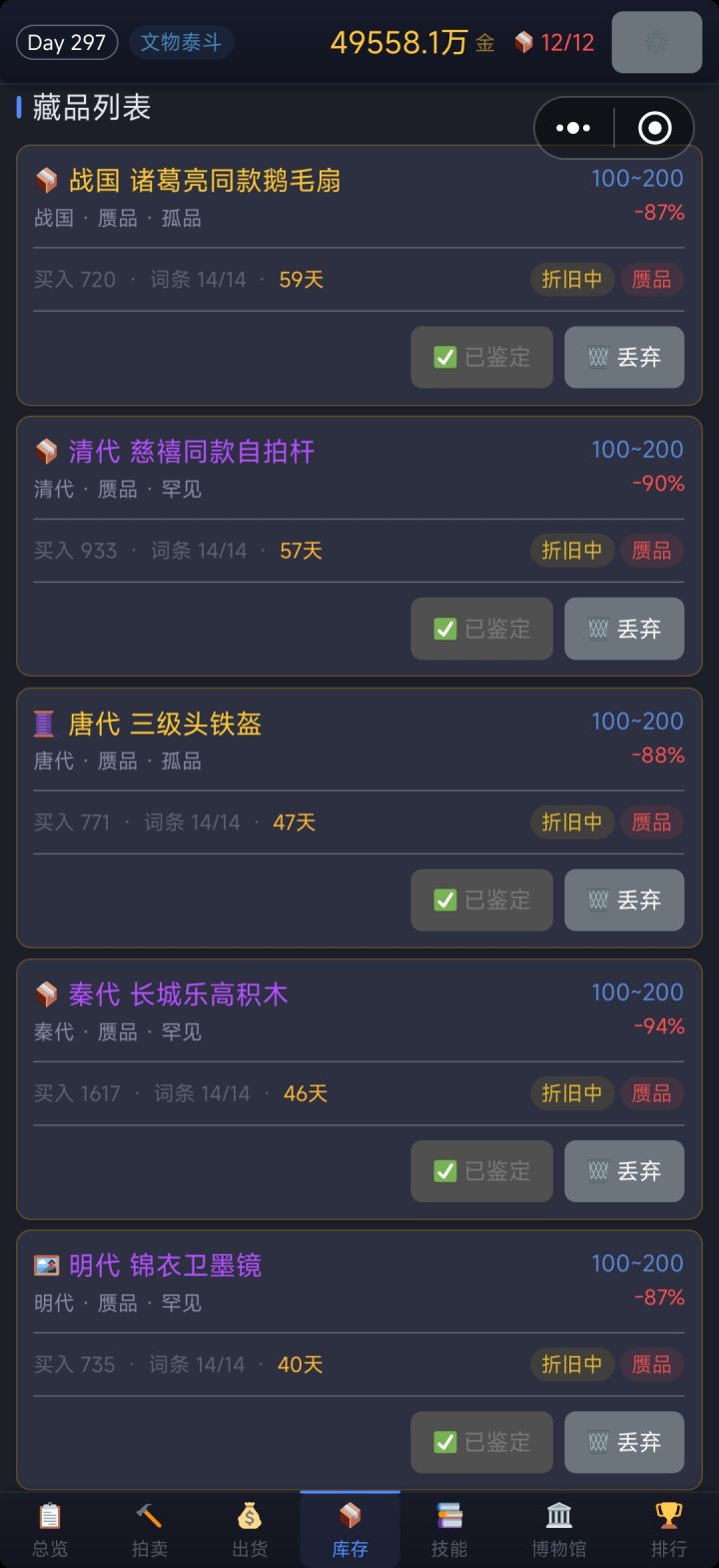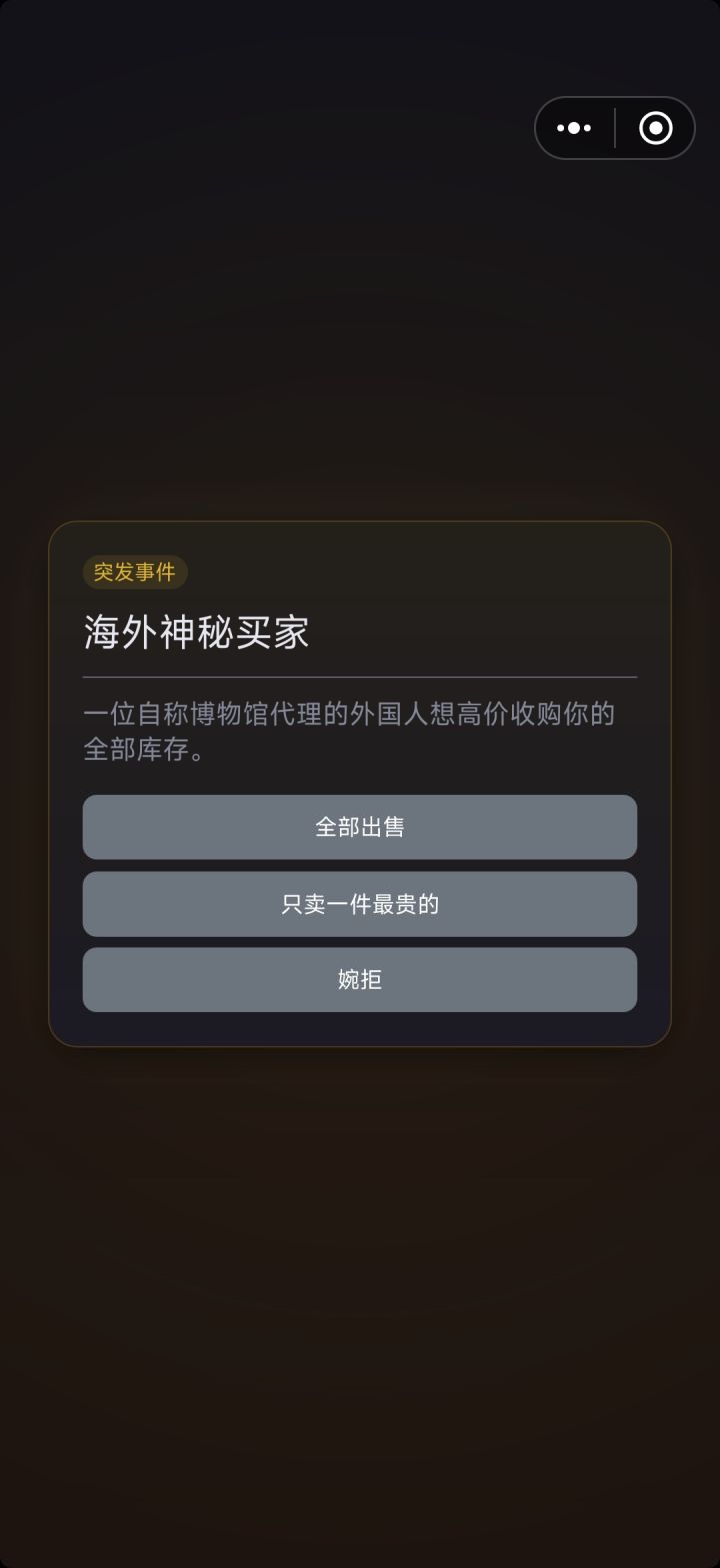 说是试玩版,意思是现在的内容还不完整——文物种类、玩法、随机事件都还在补,数值平衡也没最终定。但核心玩法已经跑通了,词条迷雾、拍卖竞价、随机文物这些都可以正常体验。我们现在最需要的是真实的游玩反馈,所以把这个版本放出来。玩完之后有什么想说的都可以回帖,不管是——- 某场拍卖感觉节奏不对- 词条信息给多了/给少了- 某件文物估价感觉离谱- 界面哪里看不懂- 或者就是单纯觉得哪里不爽都