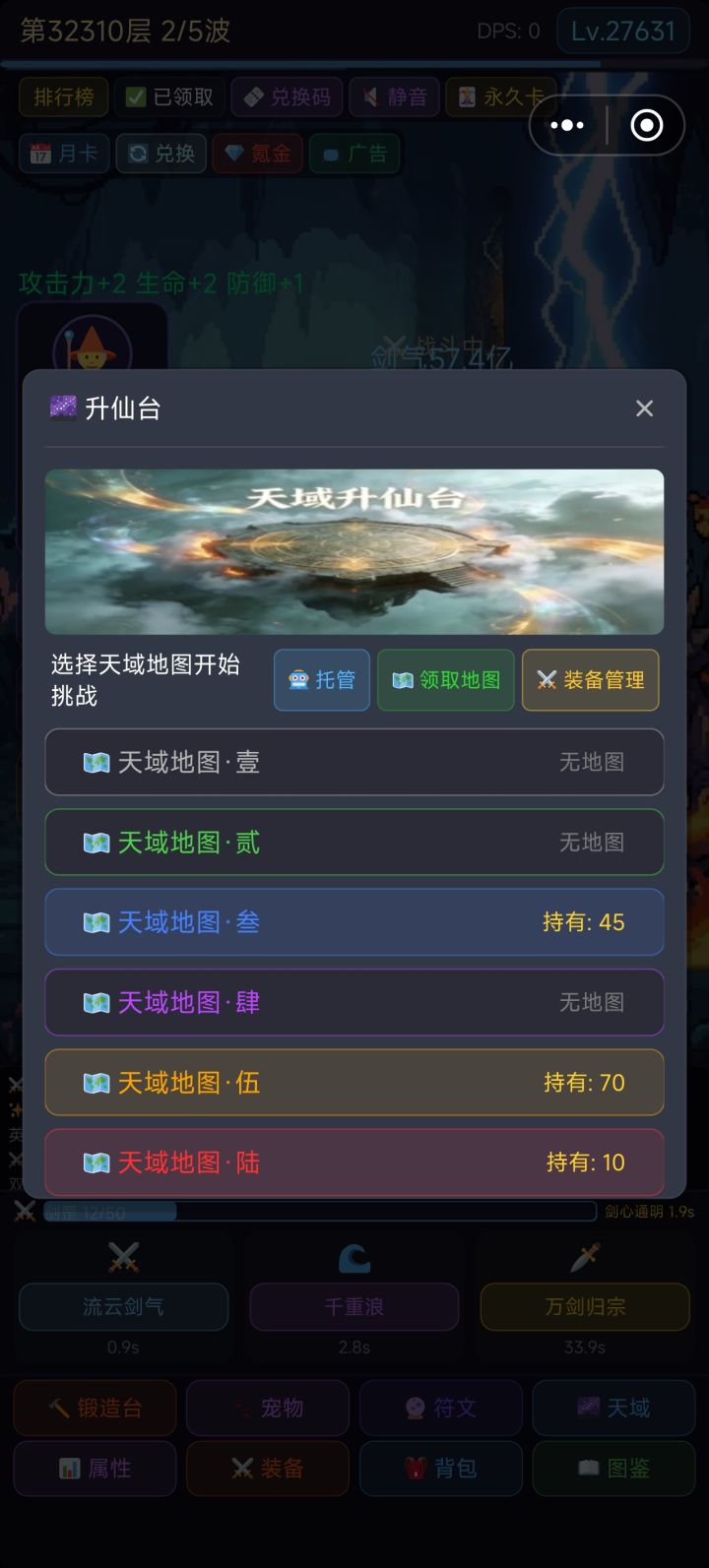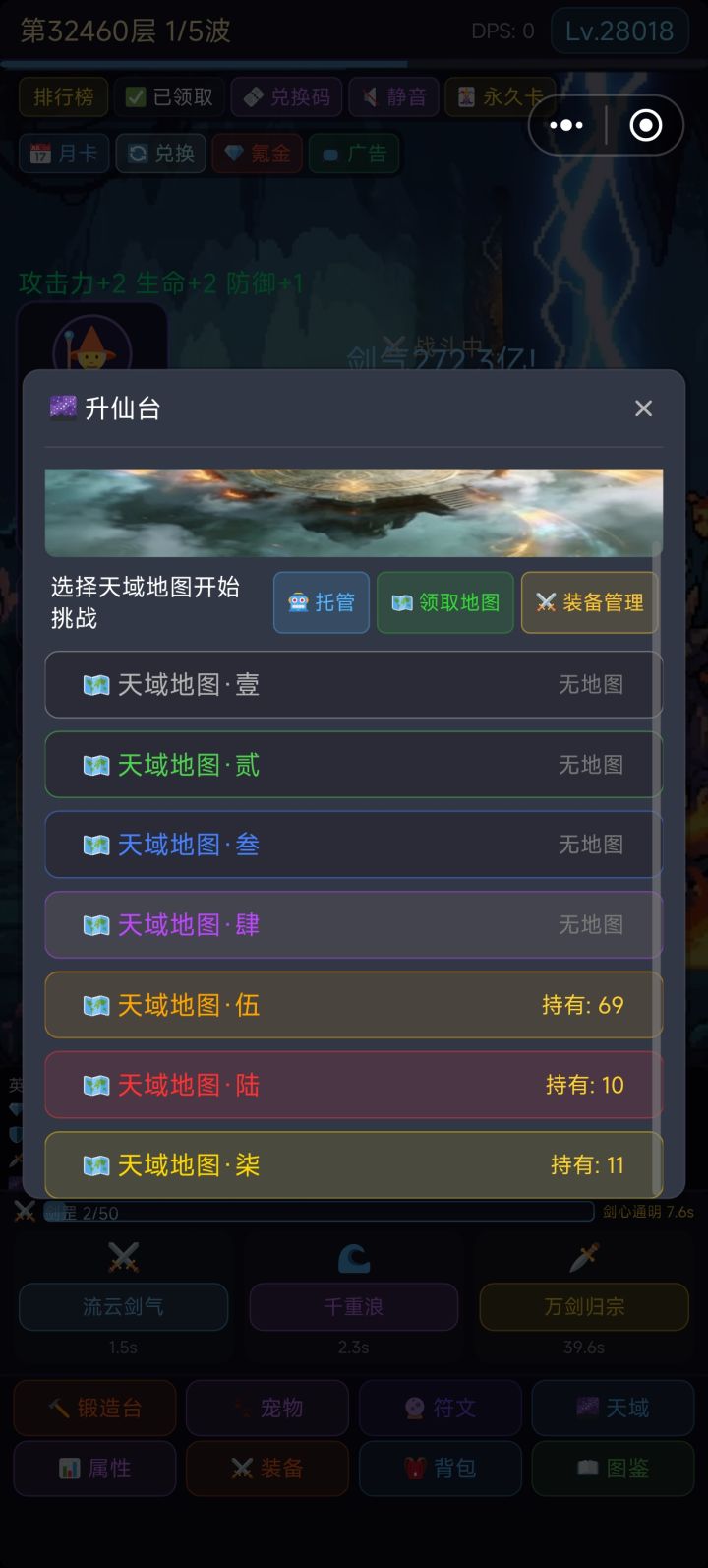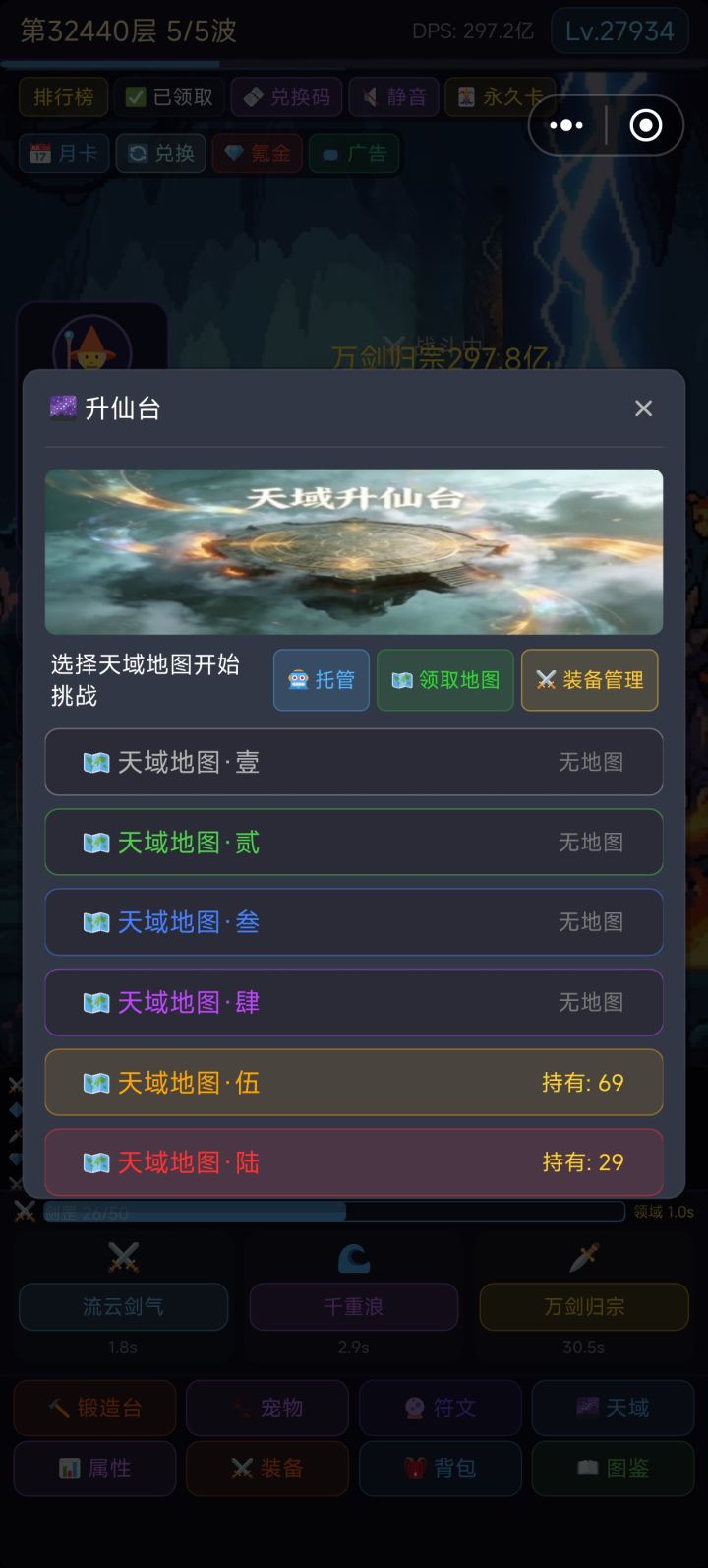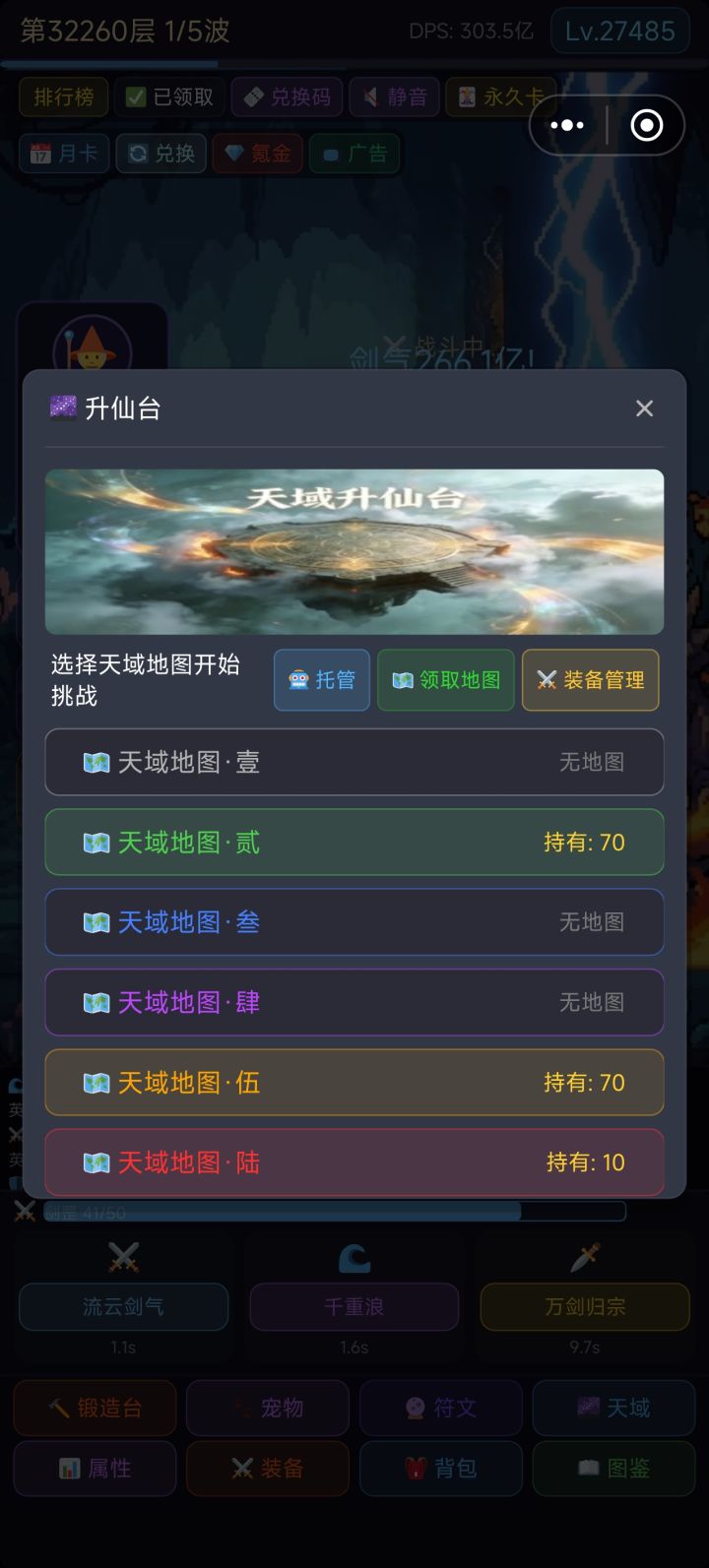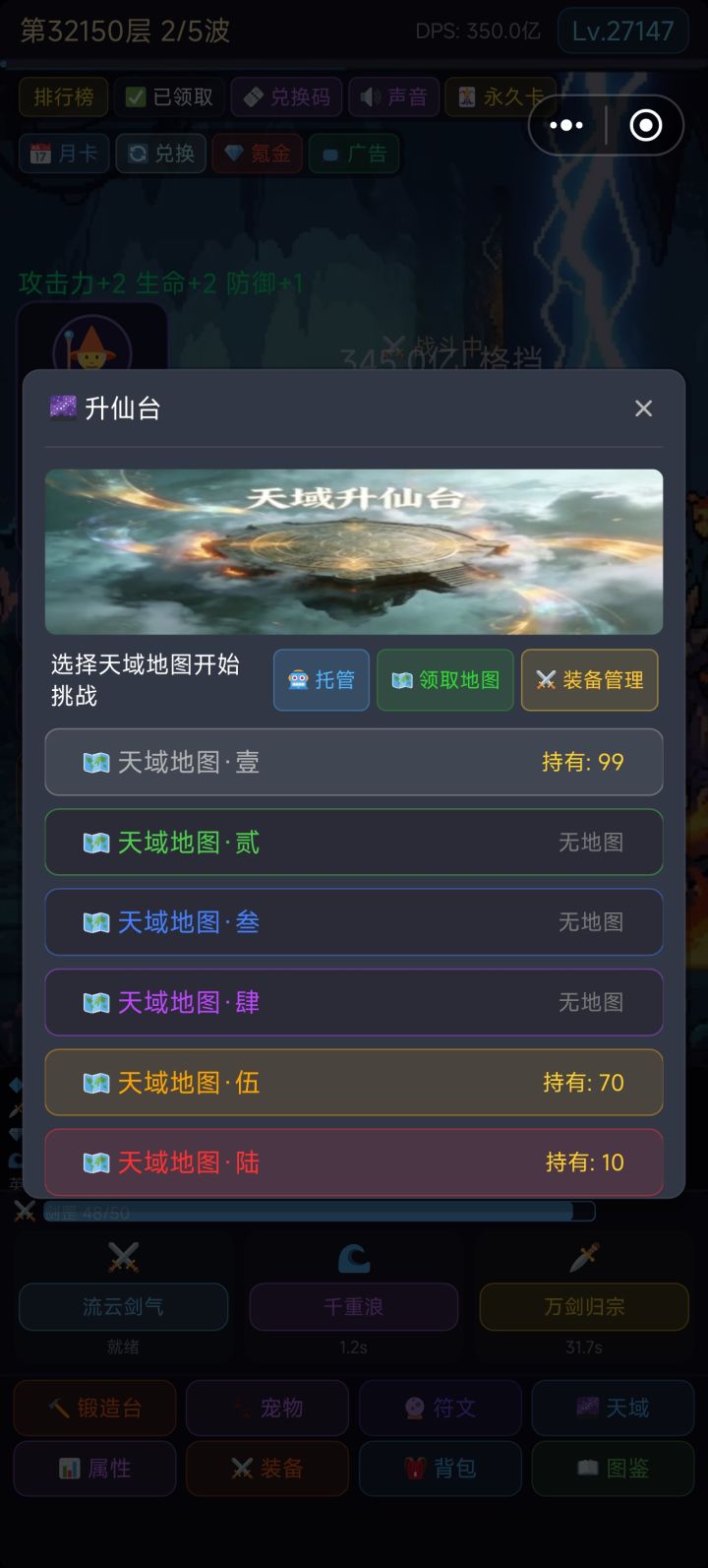 天域玩法上线测试,本玩法为规规矩矩的放置玩法,流程较慢,收益很好,天域装备的词条都是属性总增祝大家玩的开心!边测试边修吧