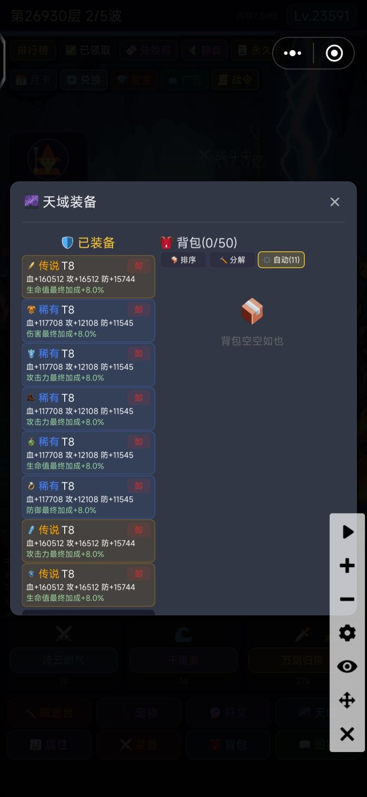 已知8阶boss12.8w攻防,8阶橙装16512,蓝装12108,词条属性不生效,计算可得,7件橙装一件蓝攻击为127692<128000,也就是你得8件橙装才能打得过boss,少一件都打不过。然后明显在6层以后橙装爆率变少了,我肝一天了才出3件橙装。顺便吐槽一下,这个天域地图的词缀效果,必须得打死boss才能有,而很多情况,都是打不过boss,只能打小怪磨装备,这时候词缀效果就没