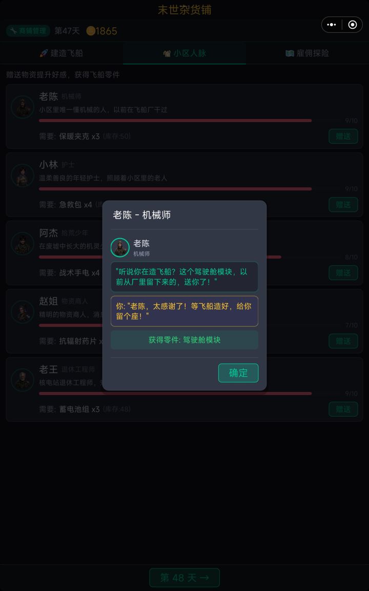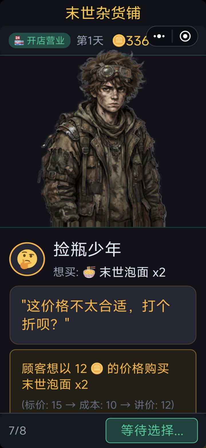 大家好,根据大家近期的反馈,更新了1.0.9版本,内容如下:1. 增加了音乐和音效系统,增加了重开游戏功能,在界面的左下角【设置】按钮进入(在某些阶段因为左下角要显示关键信息,就没有设置按钮)2. 对于讲价的客人,增加了【真理】选项,可以用真理吓退他,接下来就没人还价了,但第二天客人会减少2名。3. 增加稀有商品机制,都是烤鸭、烤乳猪这种末世难得的美食,据说有人高价收购,可信度为X%,请根据