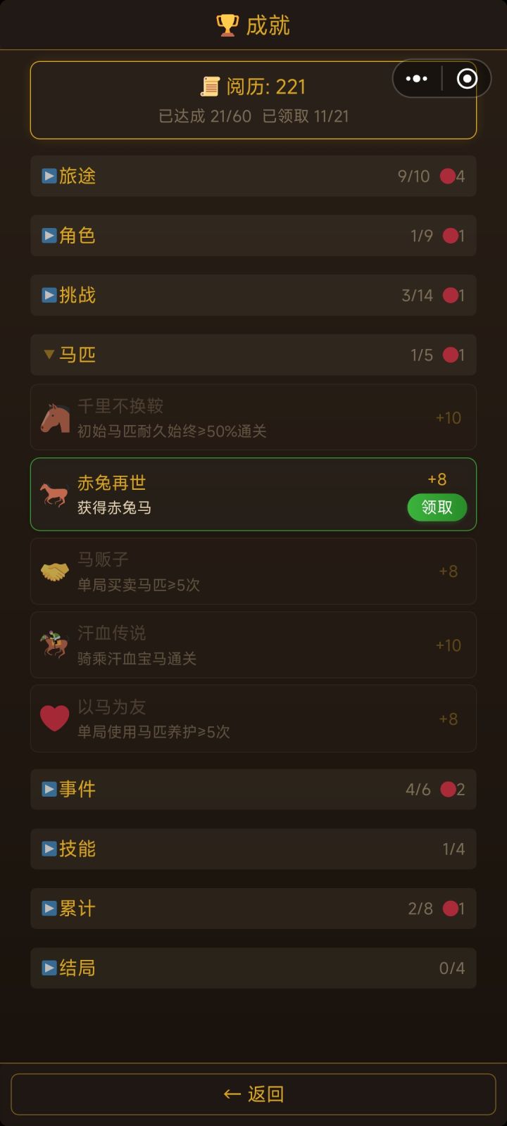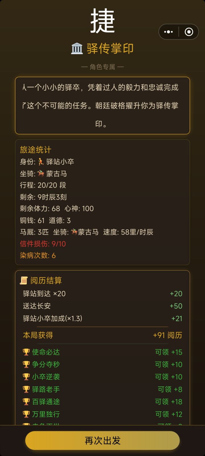 驿站小卒连死三次,才成功了一回。重点是要换马!倒是攒了不少阅历,下回换富商之子试试。