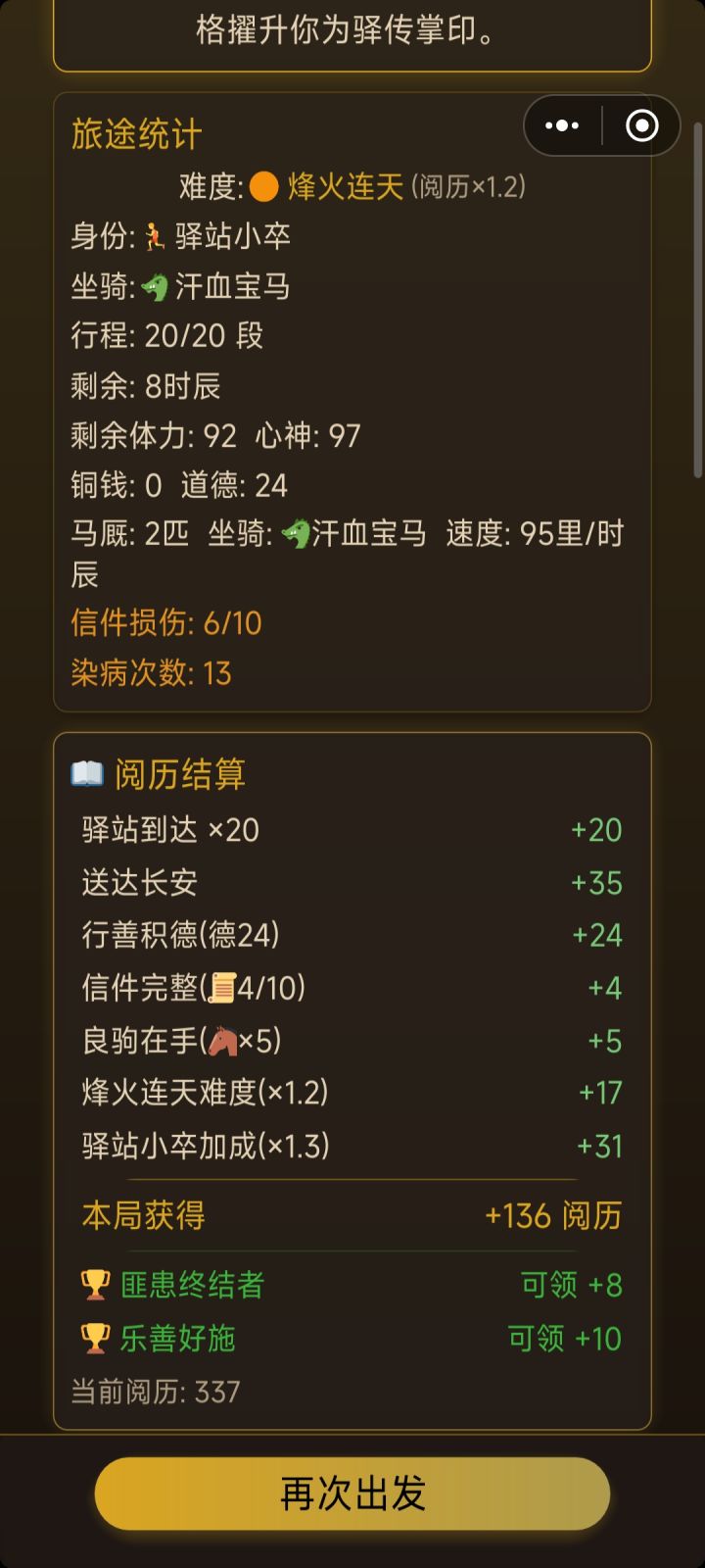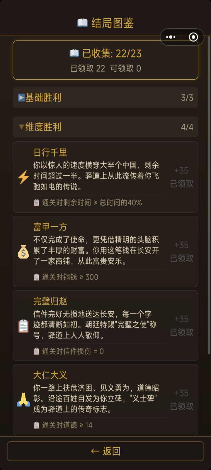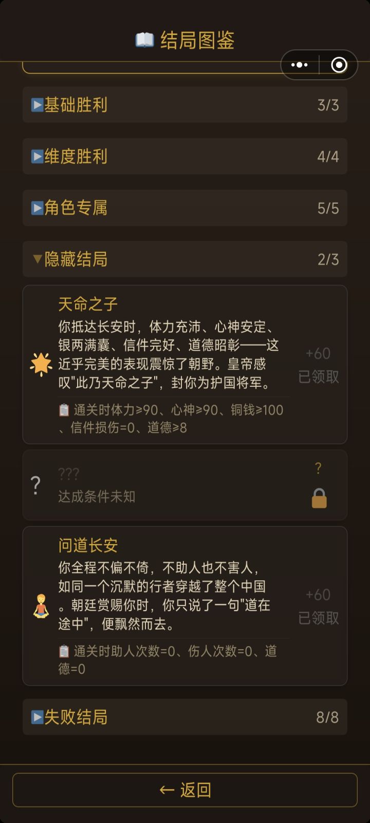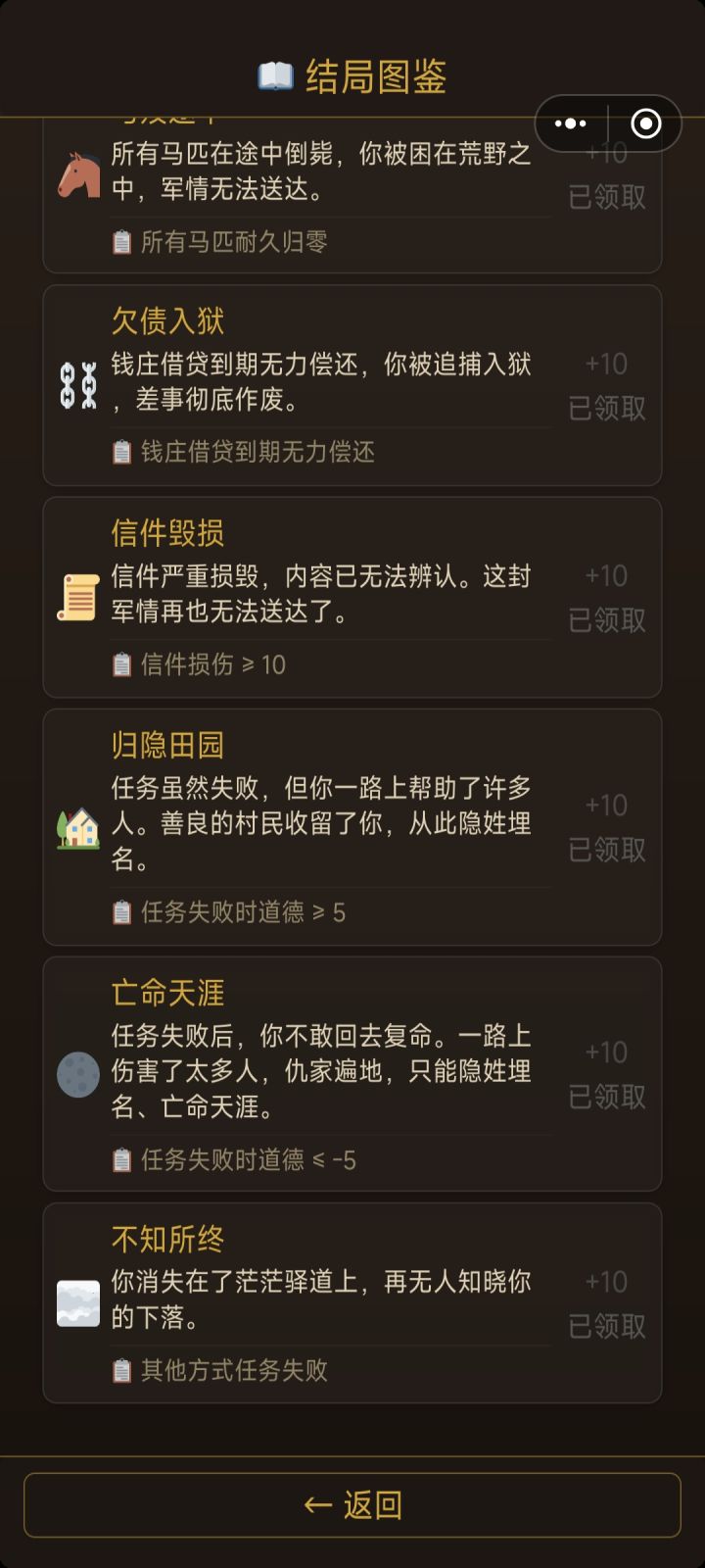 我有几个想法:1:如果抵达长安不加更多阅历,可以考虑从铜钱和剩余时间换算为阅历,建议是20或25铜钱=1阅历,4时辰=1阅历2:对于结局,已达成的结局可以附上达成的条件,同时对于已达成的结局在重复达成也可以附一定的阅历奖励(高级结局10,中级结局5,失败结局2或者没有之类的)3:对于局中人物属性道德,声望等,可以另附在人物界面里头 4:对于风寒等负面buff的获取过于随机的问题:考虑出个蓑