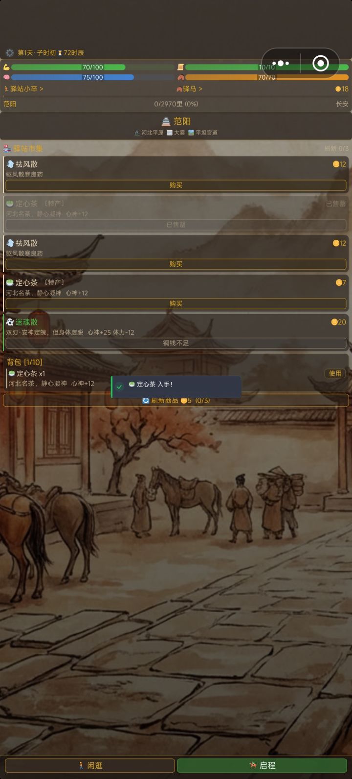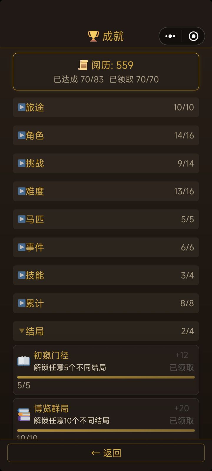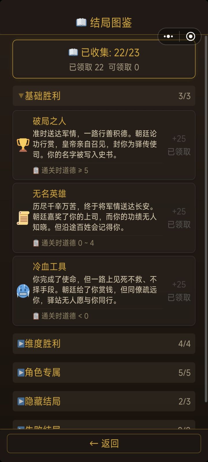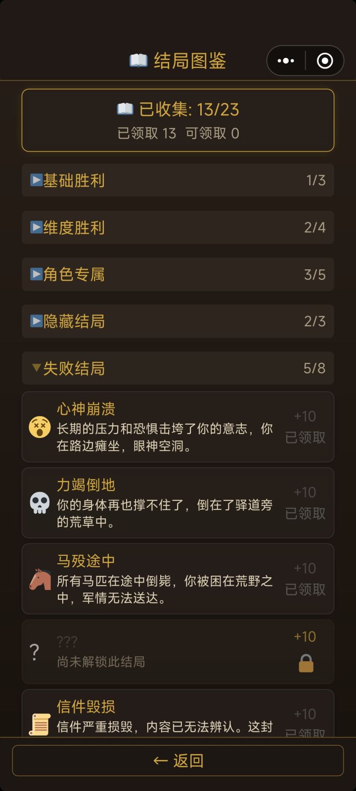 我有几个想法:1:如果抵达长安不加更多阅历,可以考虑从铜钱和剩余时间换算为阅历,建议是20或25铜钱=1阅历,4时辰=1阅历2:对于结局,已达成的结局可以附上达成的条件,同时对于已达成的结局在重复达成也可以附一定的阅历奖励(高级结局10,中级结局5,失败结局2或者没有之类的)3:对于局中人物属性道德,声望等,可以另附在人物界面里头 4:对于风寒等负面buff的获取过于随机的问题:考虑出个蓑