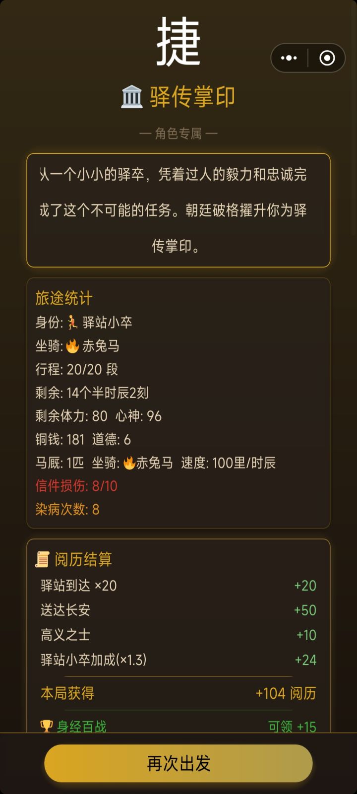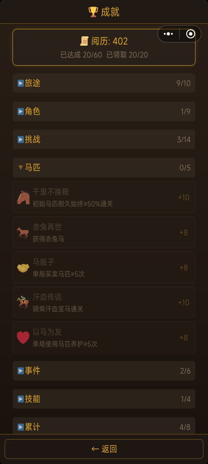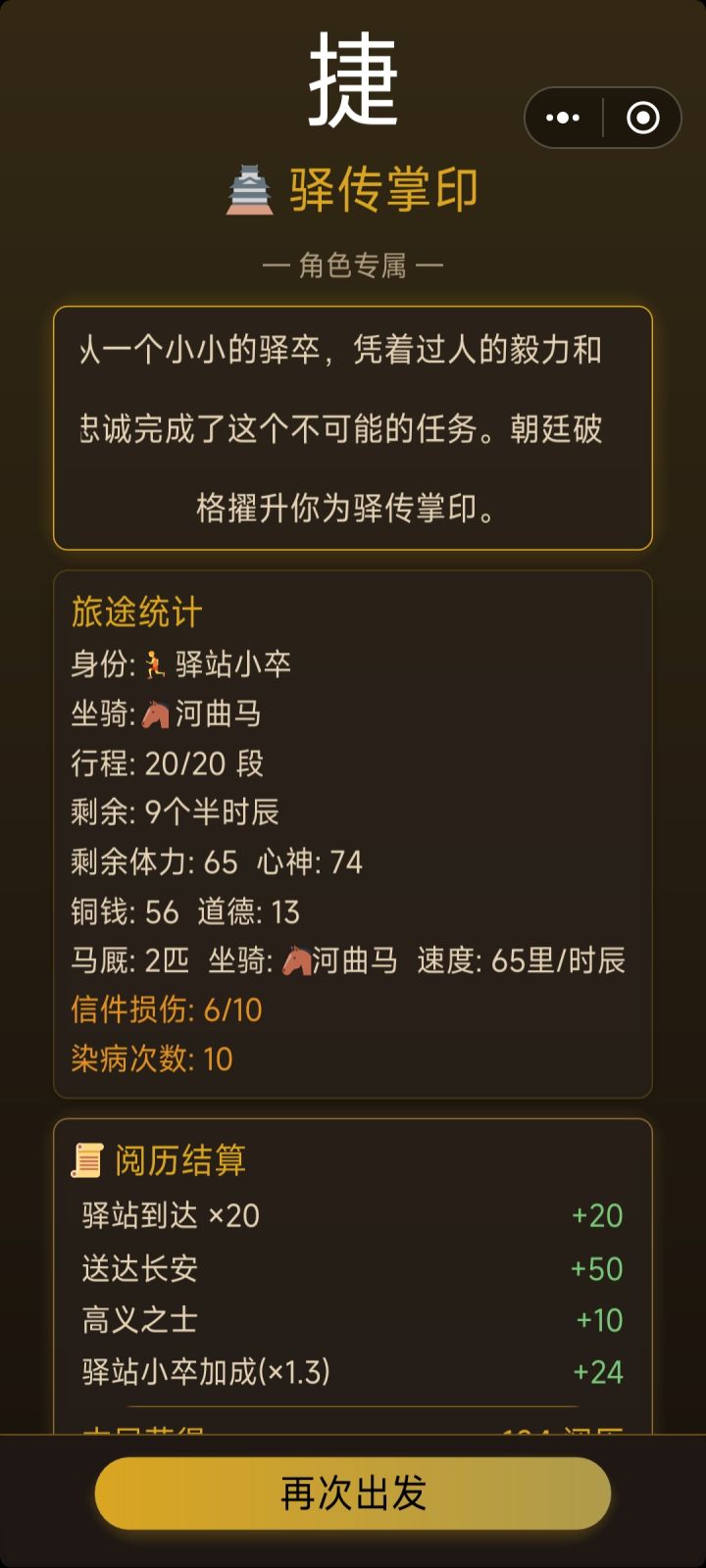 我有几个想法:1:如果抵达长安不加更多阅历,可以考虑从铜钱和剩余时间换算为阅历,建议是20或25铜钱=1阅历,4时辰=1阅历2:对于结局,已达成的结局可以附上达成的条件,同时对于已达成的结局在重复达成也可以附一定的阅历奖励(高级结局10,中级结局5,失败结局2或者没有之类的)3:对于局中人物属性道德,声望等,可以另附在人物界面里头 4:对于风寒等负面buff的获取过于随机的问题:考虑出个蓑